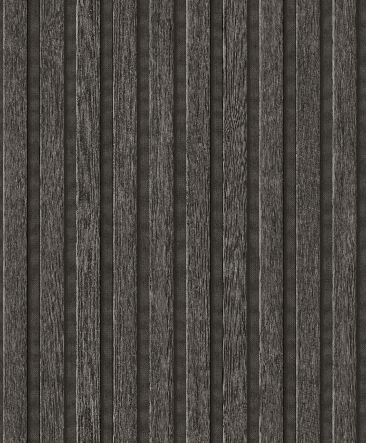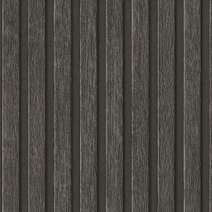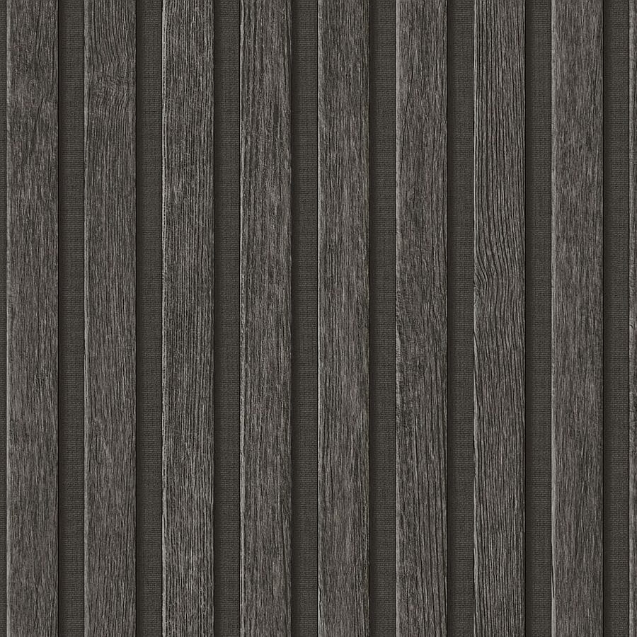 Tapeta imitująca naturalne, drewniane lamele w ciemnoszarym odcieniu.