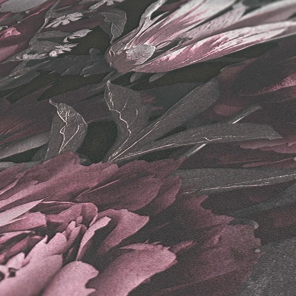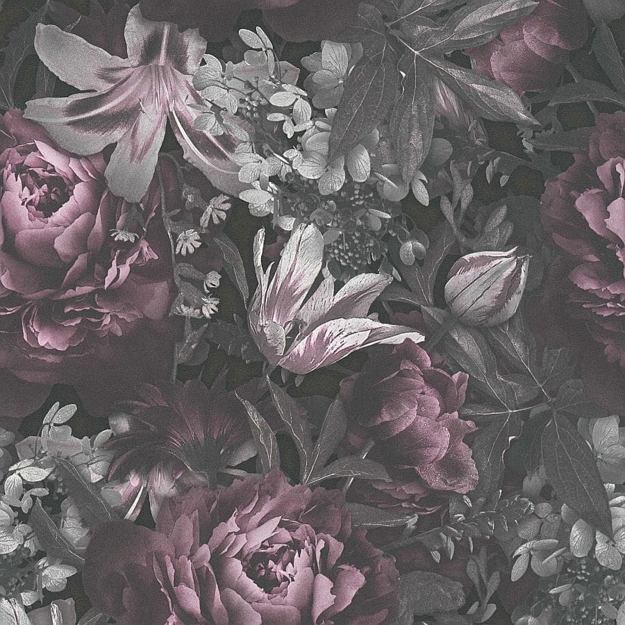 - Kolorystyka: na ciemnym szarym tle wyraźne fioletowe piwonie, szare lilie i hortensje