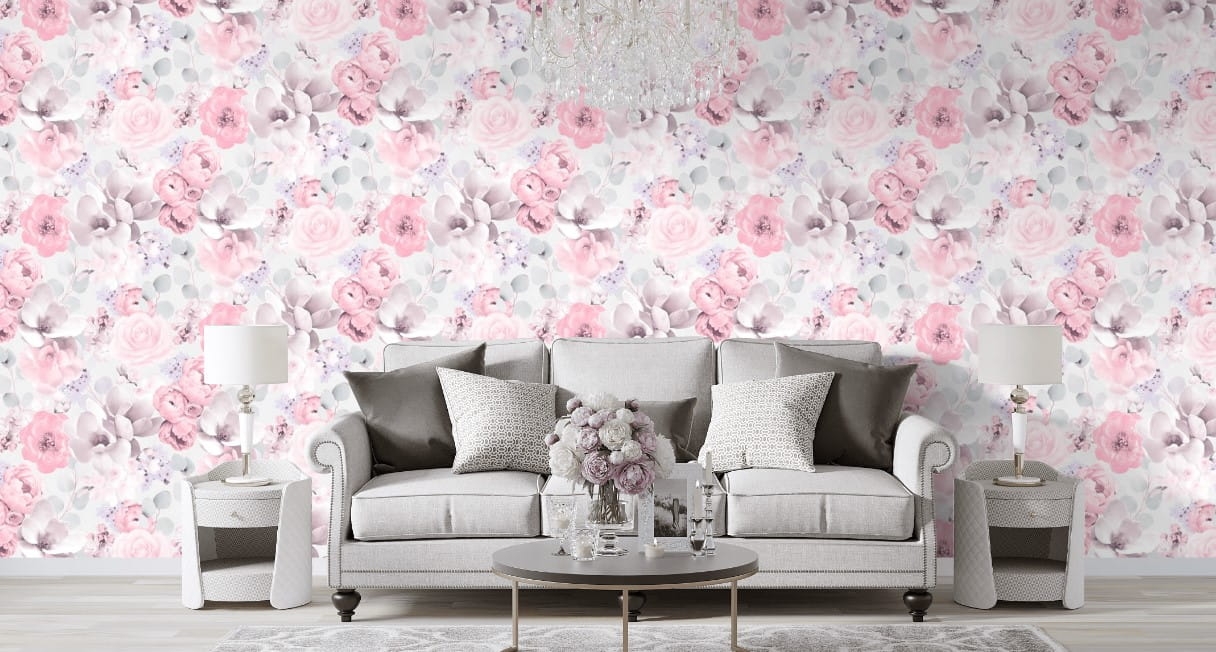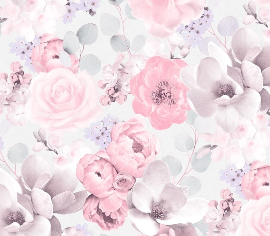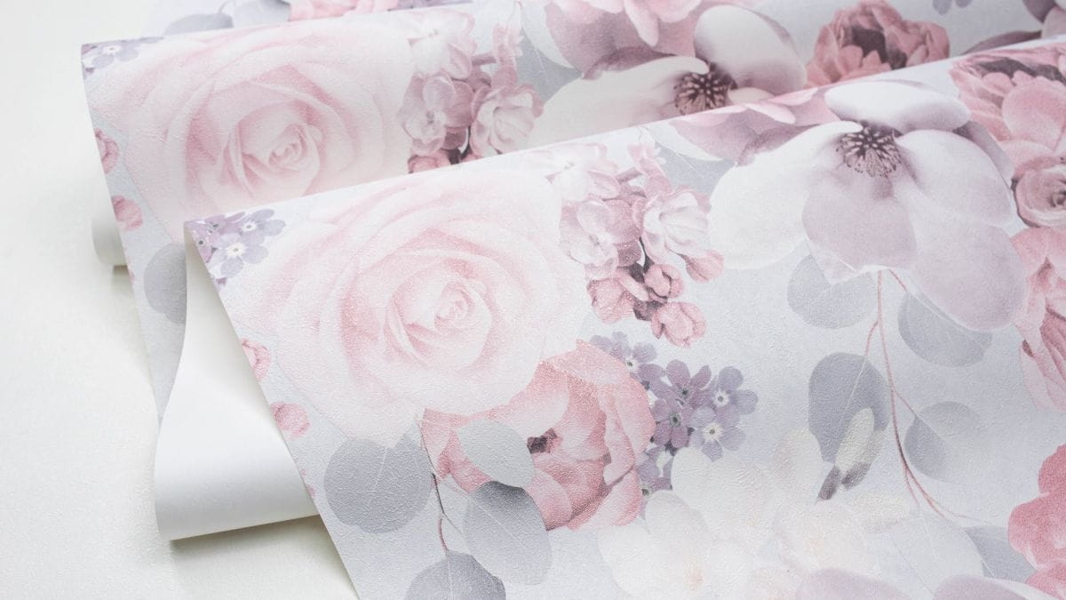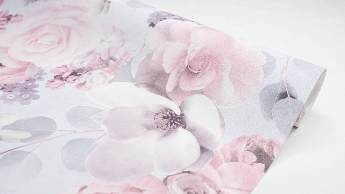 Tapeta pokojowa. Wzór z efektem 3D przedstawiający kwiaty w odcieniach jasnej szarości i pudrowego różu. Struktura powierzchni to drobnoziarnista przecierka, która zatuszuje delikatne nierówności na ścianach.