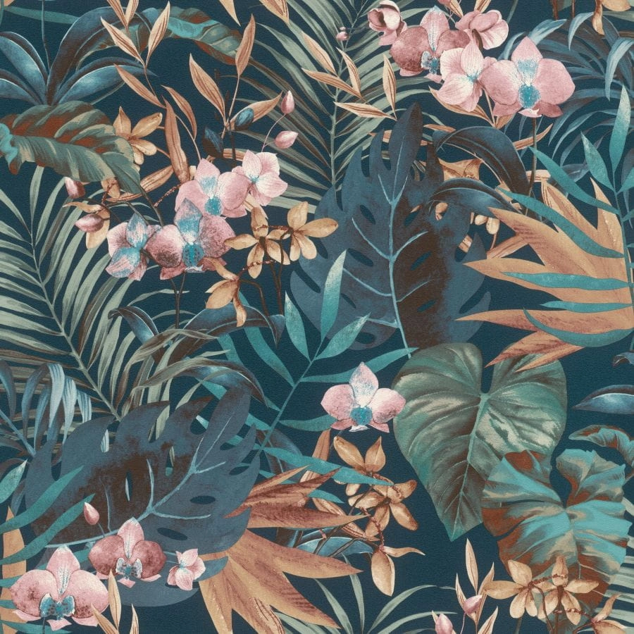 Tapeta ścienna winylowa na flizelinie, z motywem dużych liści i kwiatów na ciemnym, turkusowym tle.