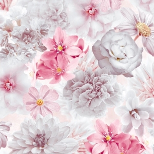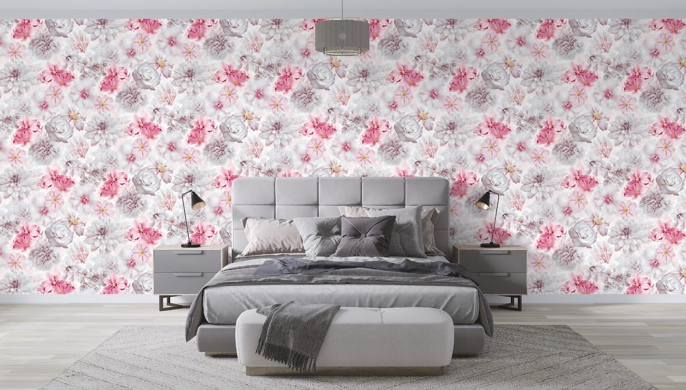 - Kwiaty: Tapeta przedstawia różnorodne kwiaty, w tym różowe i białe, które są głównymi elementami wzoru.