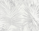 Struktura tapety: matowa, delikatnie tłoczona, chropowata w dotyku. Faktura przypomina splot tkaninowy. Tapetę gęsto wypełniają duże palmowe liście, o lekko rozmytym/cieniowanym kolorze, tworzą ciekawą, naturalną aranżację ścienną.