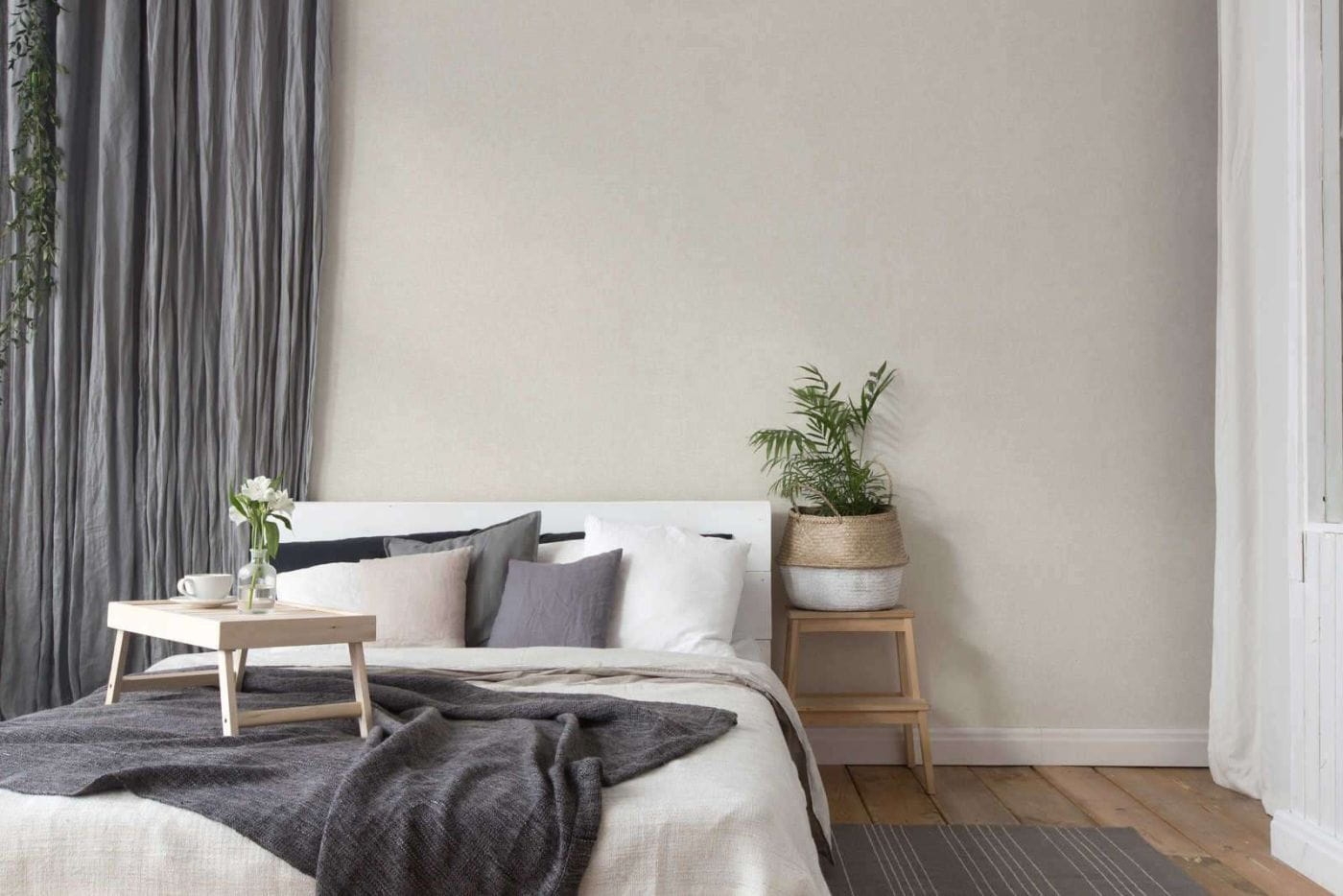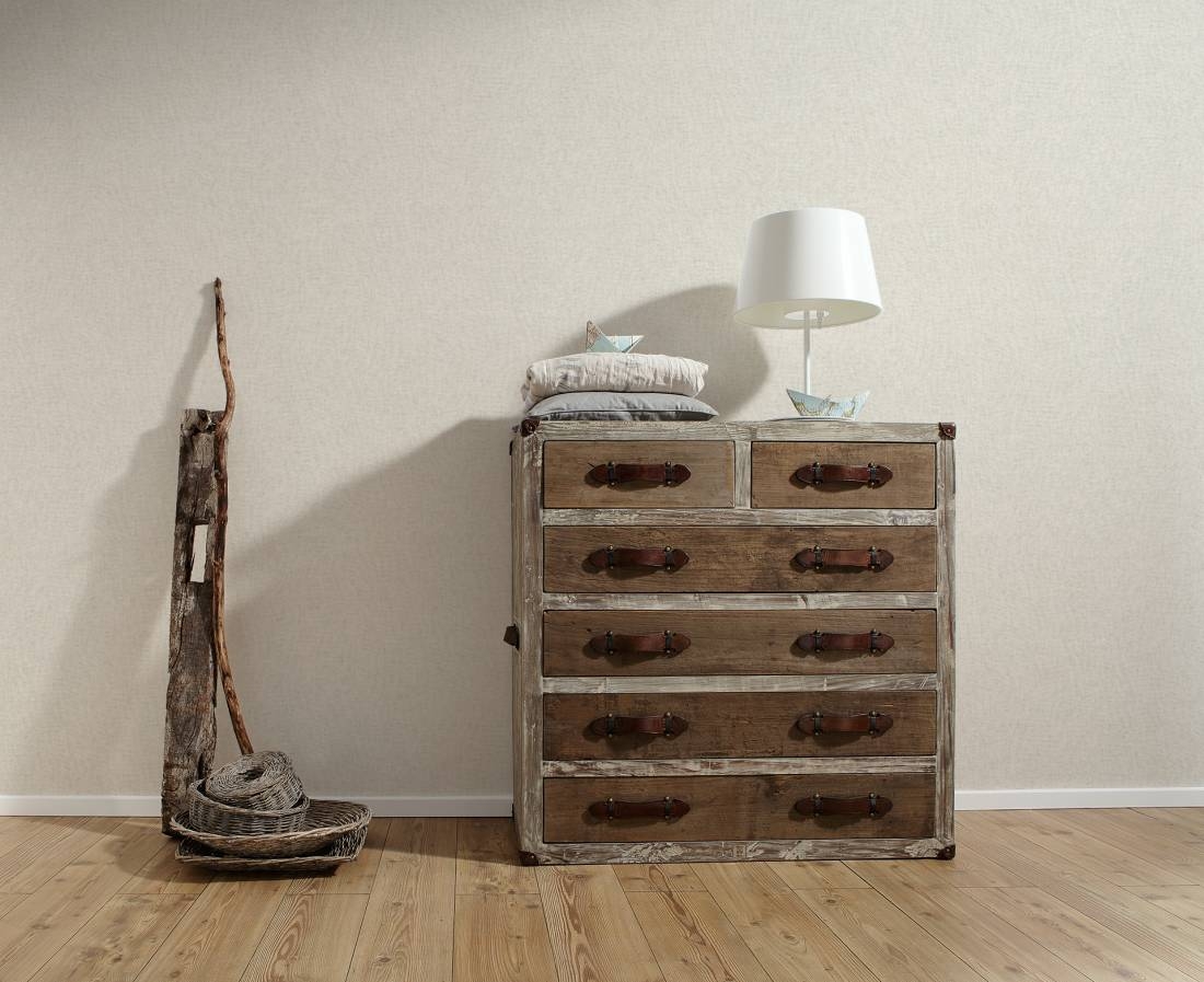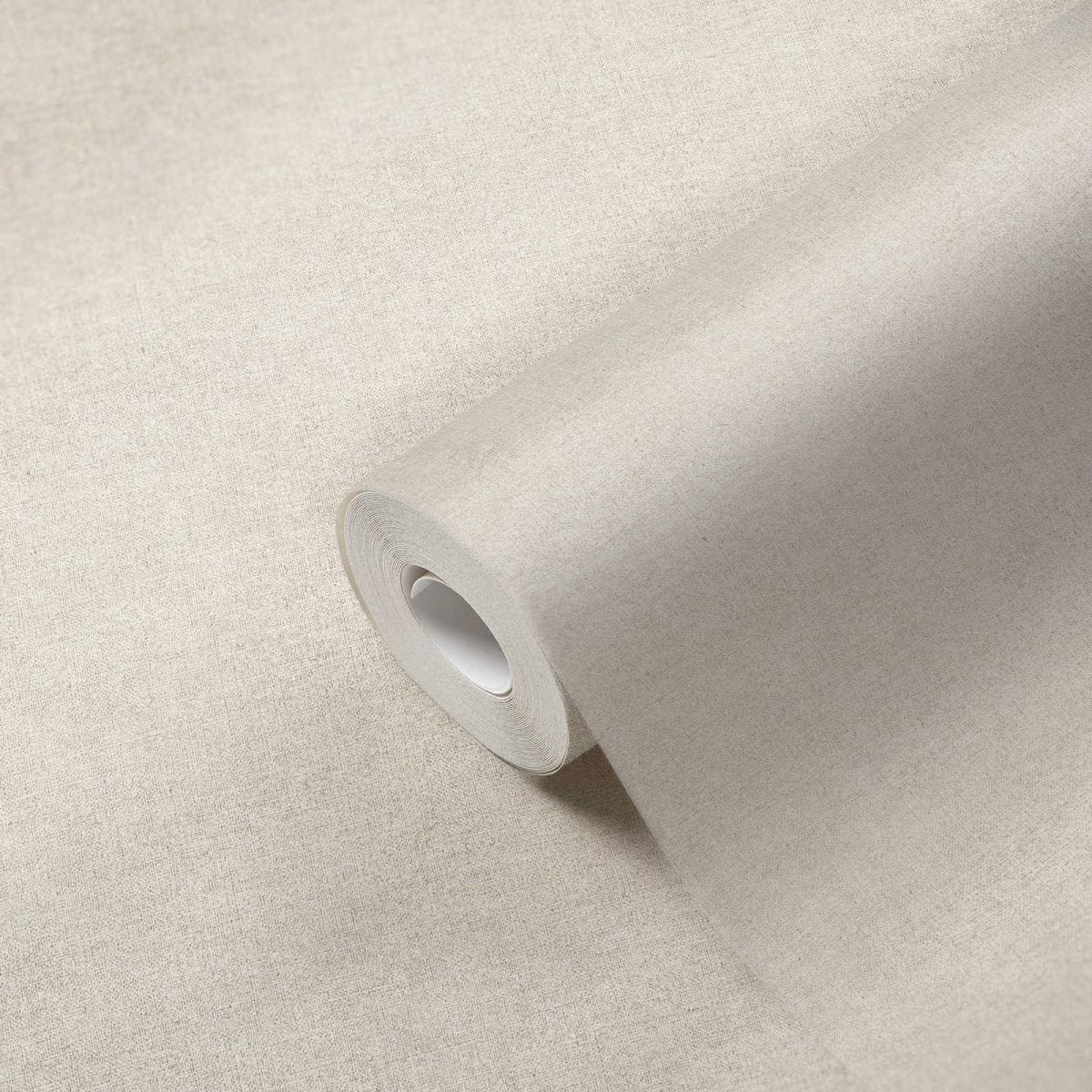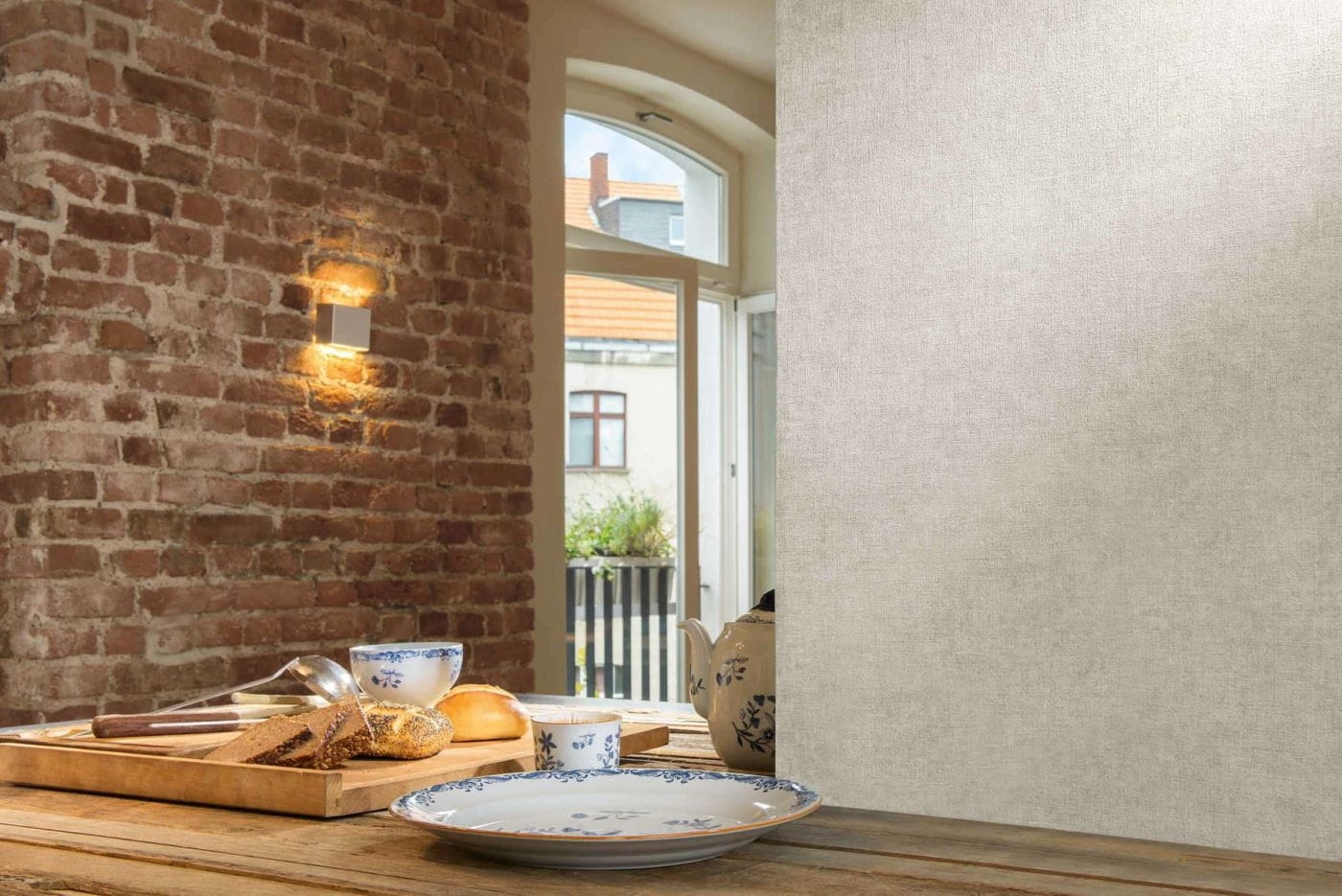 Struktura tapety: delikatnie chropowata w dotyku. Faktura przypomina lnianą tkaninę. Kolor niejednolity, lekko przecierany.