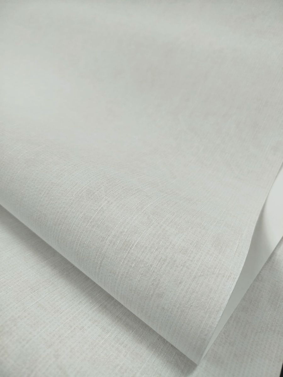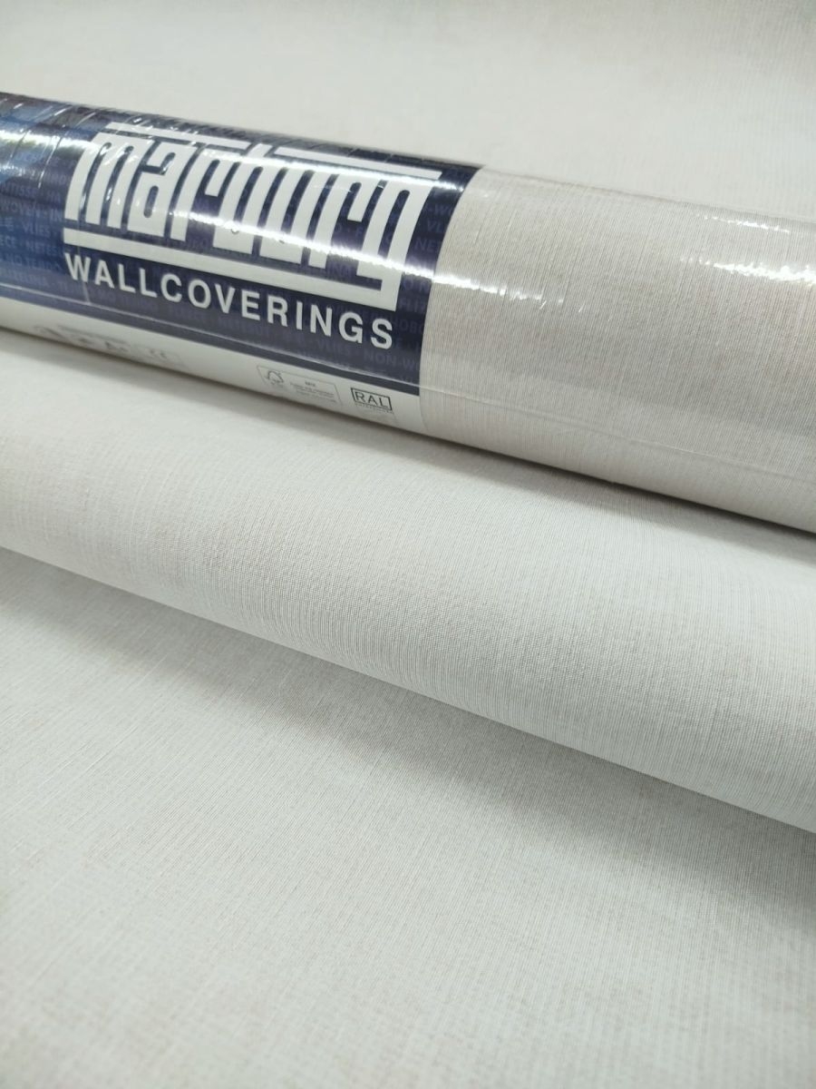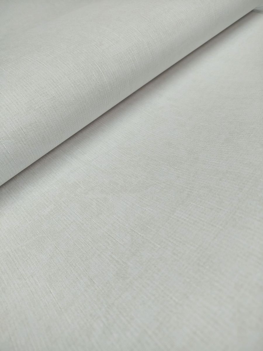 Struktura tapety: delikatnie chropowata w dotyku. Faktura lekko tłoczona, formuje się w delikatne pionowe prążki. Kolor niejednolity, lekko przecierany, gdzieniegdzie widoczne metaliczne refleksy, pionowe nitki.