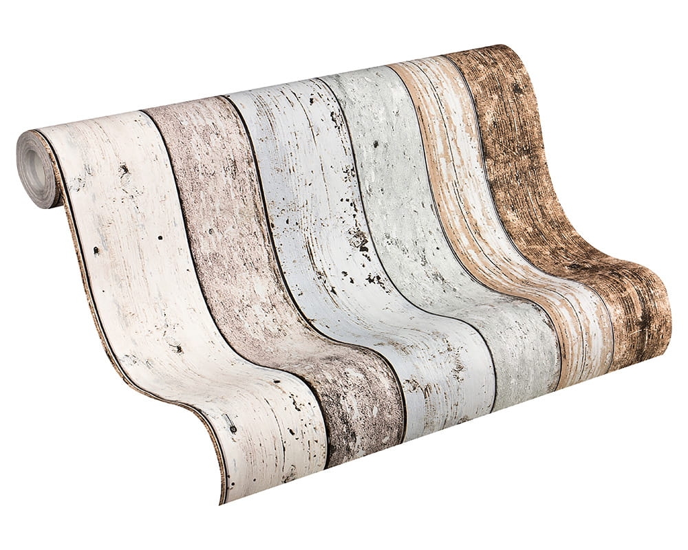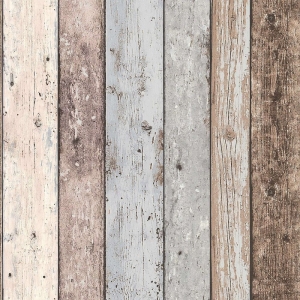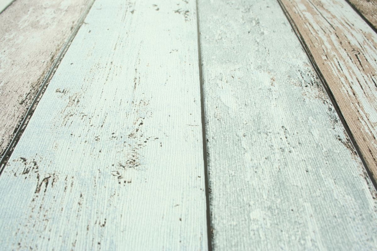 Struktura tapety: Tapeta delikatnie tłoczona, wyczuwalne pionowe prążki. Bardzo oryginalny wzór- przedstawia deski poukładane w formie boazerii, o różnej szerokości z widocznymi sękami, zadrapaniami, odarciami koloru- stare/ postarzałe drewno, pokryte różnymi kolorami, ukazane jest w sposób bardzo realistyczny. Wzór z pewnością nada wnętrzu klimatu.