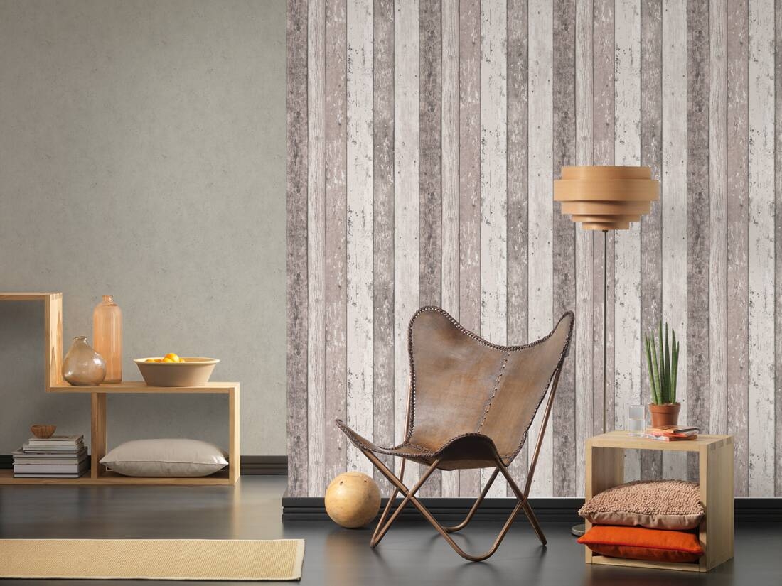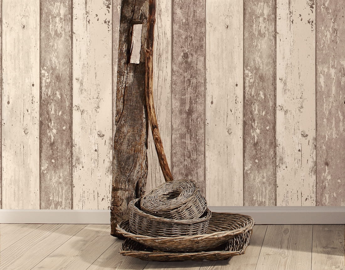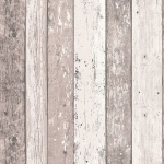 Struktura tapety: Tapeta delikatnie tłoczona, wyczuwalne pionowe prążki. Bardzo oryginalny wzór- przedstawia deski poukładane w formie boazerii, o różnej szerokości z widocznymi sękami, zadrapaniami, odarciami koloru- stare/ postarzałe drewno, pokryte różnymi kolorami, ukazane jest w sposób bardzo realistyczny. Wzór z pewnością nada wnętrzu klimatu.