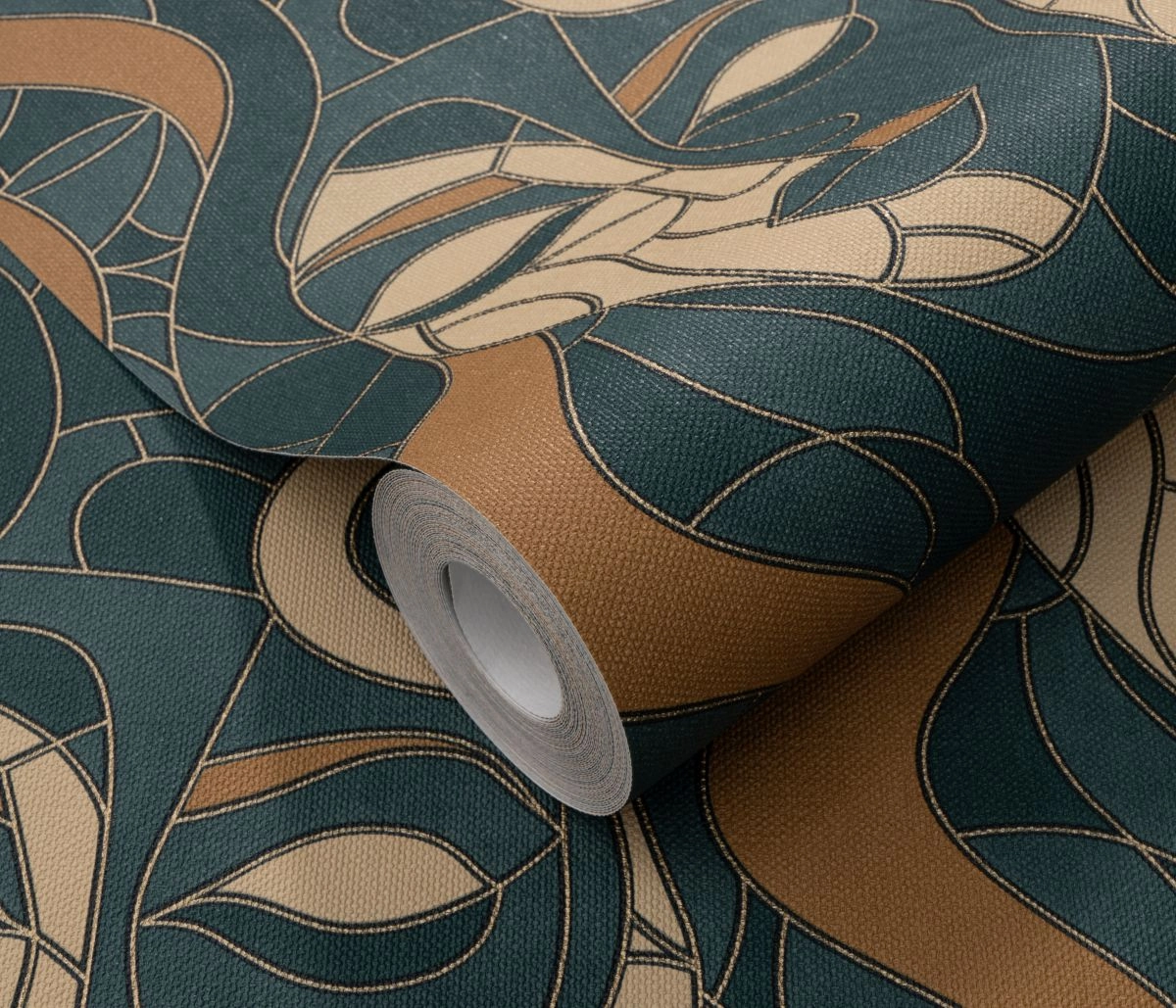 Kolorystyka: Odcienie matowego zielonego turkusu, beżu, złota, oddzielone cienką, połyskującą złotą fugą, na kształt witrażu