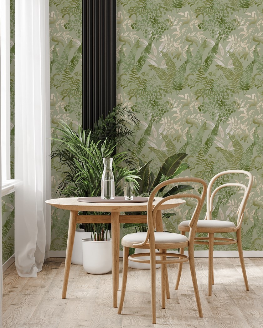 Struktura: Tapeta cechuje się delikatnie teksturowaną powierzchnią, z subtelnym uskokiem i lekkim reliefem, który daje wrażenie struktury, lecz nie jest bardzo głęboki. Motyw liści „nakłada się” na to tło — wzór jest wyrazisty, ale sama faktura nie jest agresywna ani grubo rzeźbiona. Struktura jest delikatnie wyczuwalna w dotyku.