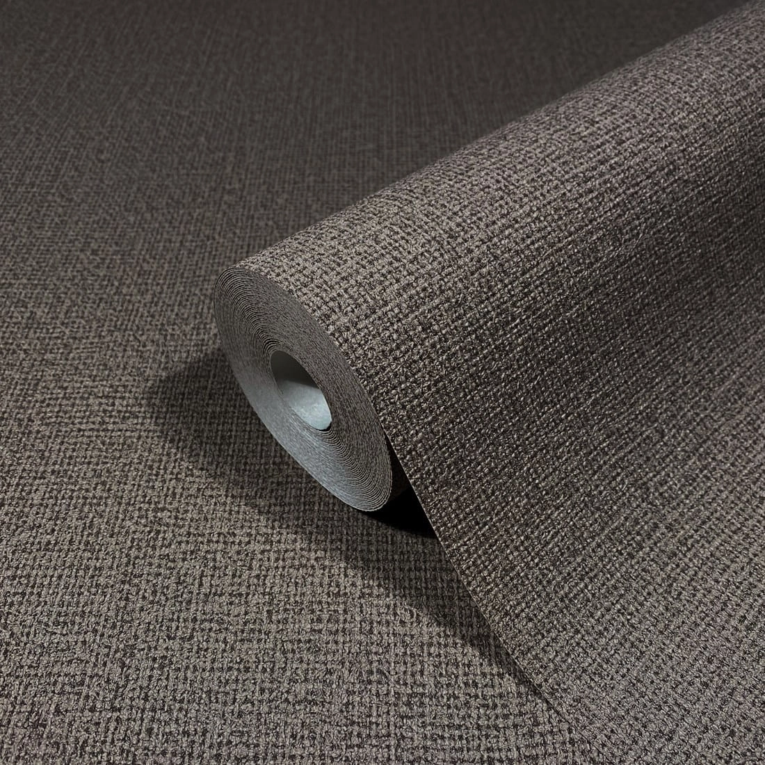 Powierzchnia delikatnie chropowata w dotyku, matowa o wyraźnym wzorze worka, lnu, tkaniny w brązowo czarnej kolorystyce.