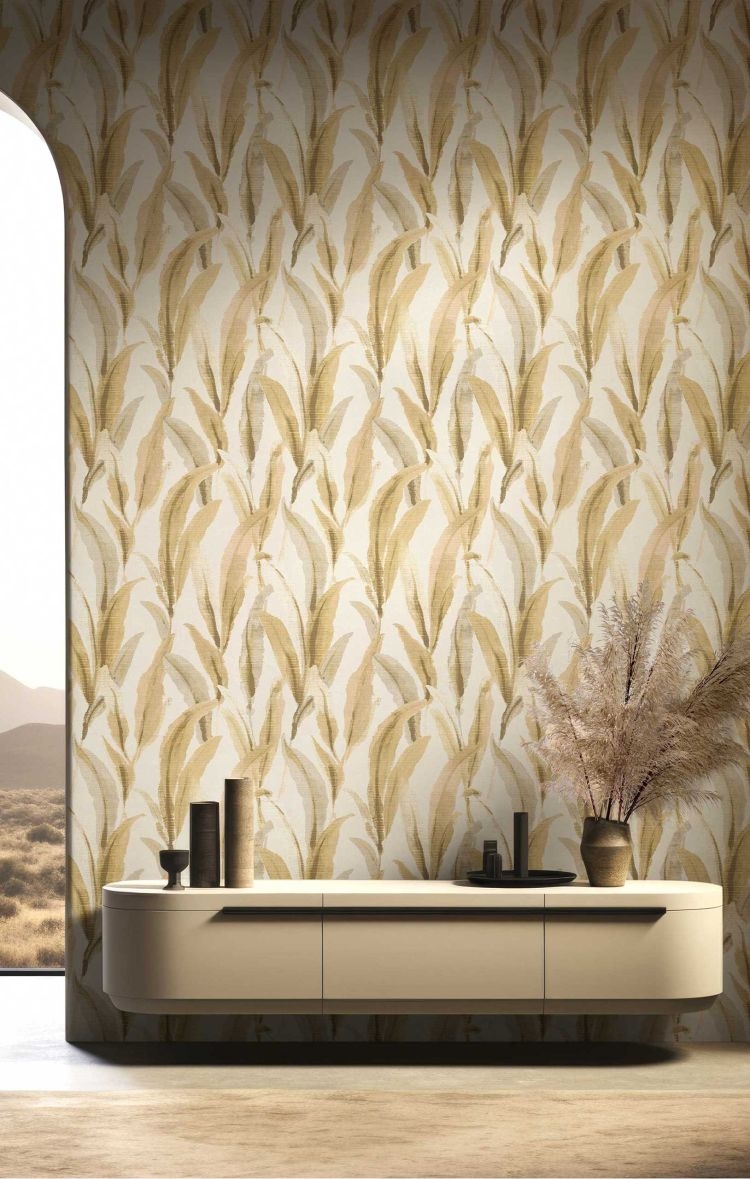 Na pierwszy rzut oka tapeta wydaje się matowa, jednak w świetle – zwłaszcza słonecznym – beżowe i brązowe elementy ujawniają subtelny, złocisty połysk dzięki drobinkom szampańskiego pyłku. Tapeta doskonale sprawdzi się jako dekoracja jednej ściany, tworząc stylowe zestawienie z innymi produktami z tej kolekcji.