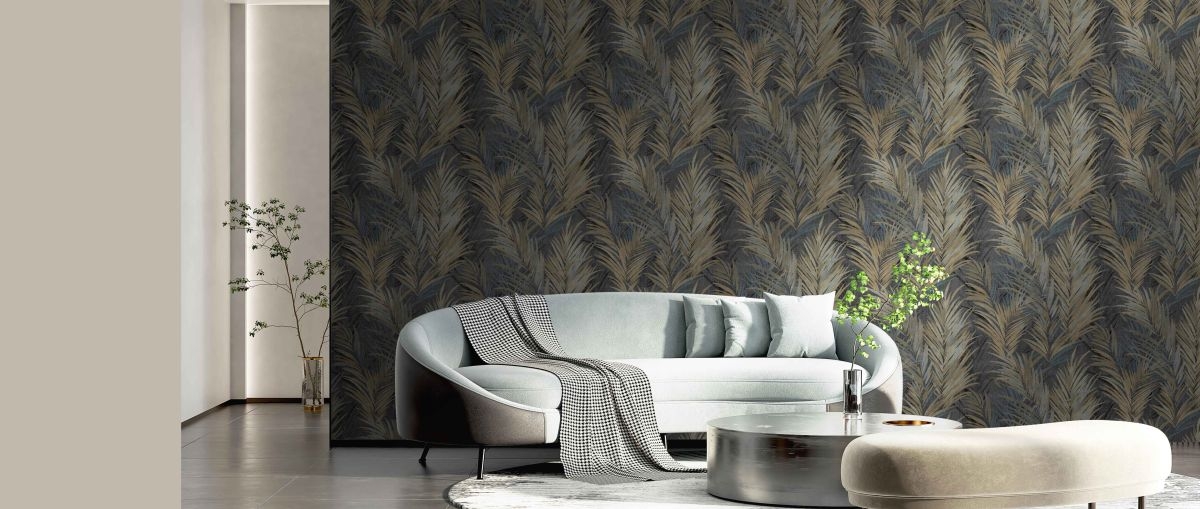 Kolorystyka: Ciemne kolory granatowy, złoty połyskujący, antracyt. Powierzchnia tapety mieni się drobinkami pod wpływem padającego światła.