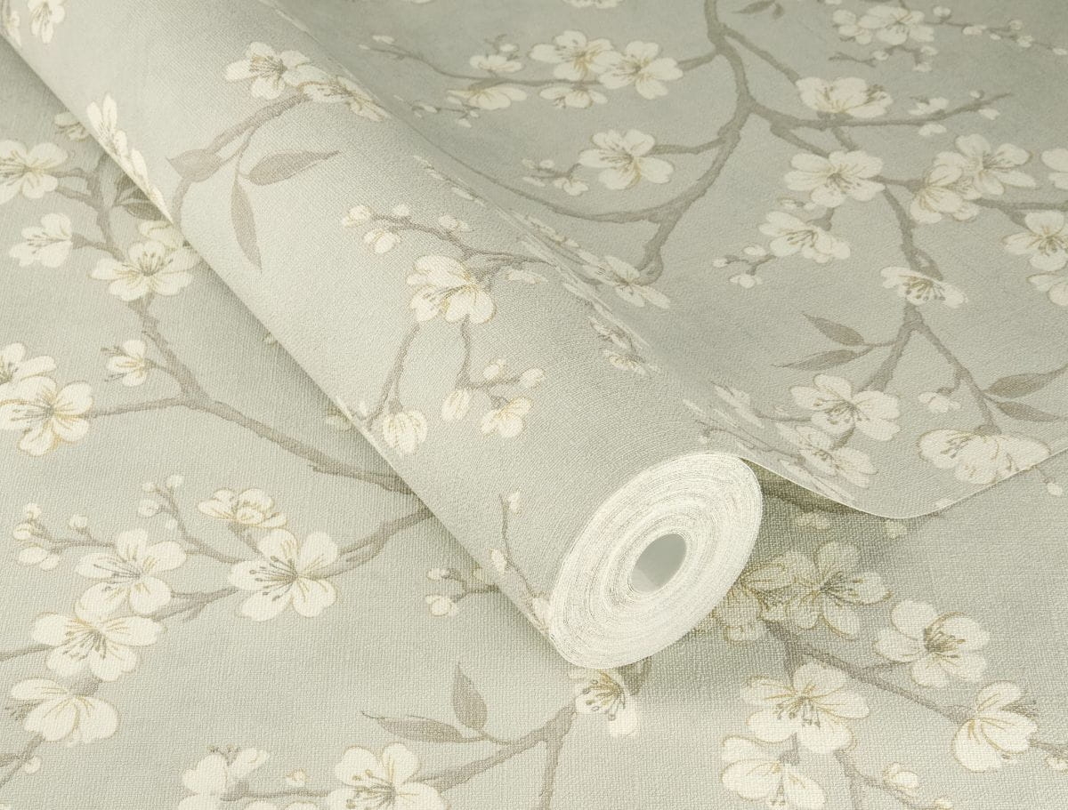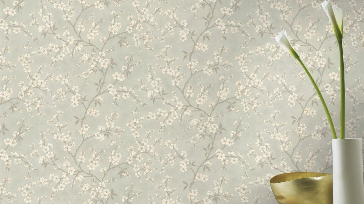 Kolorystyka: białe kwiatuszki ze złotymi metalicznymi elementami na szarym tle; odcienie szarości, biały złoty