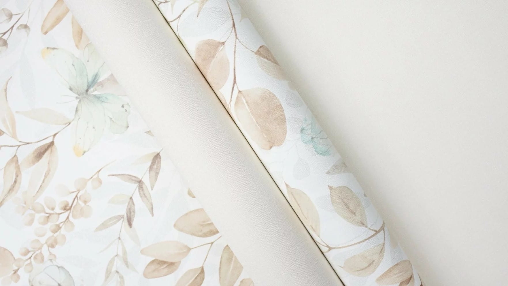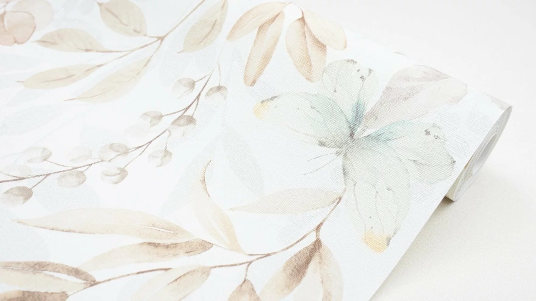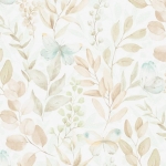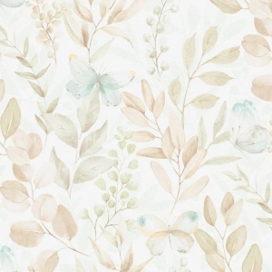 Tapeta z motywem roślinnym i zielonymi motylami. Doskonale sprawdzi się jako motyw dekoracyjny na fragmencie ściany lub jako wykończenie całego pomieszczenia.
