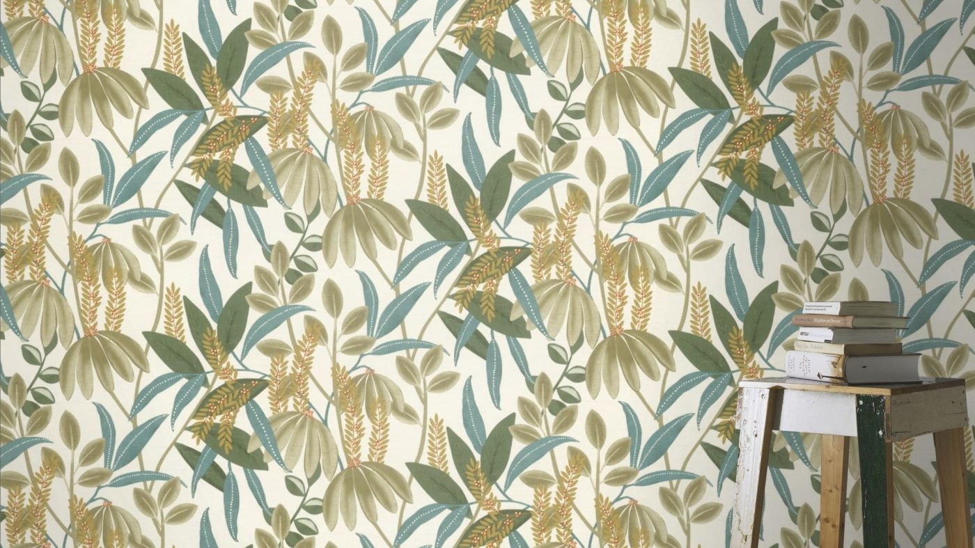 Kolorystyka: liście w odcieniach zieleni, turkusu na beżowym tle