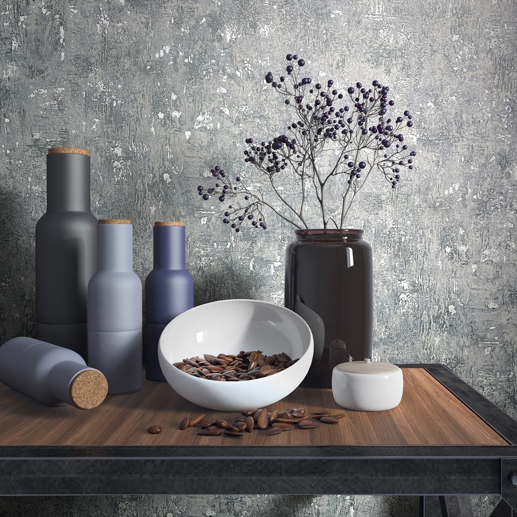 Struktura: Powierzchnia delikatnie tłoczona na kształt tynku ozdobnego. Kolor niejednolity, przecierany, matowy z elementami pobłyskujących srebrnych refleksów imitujące tynk wenecki