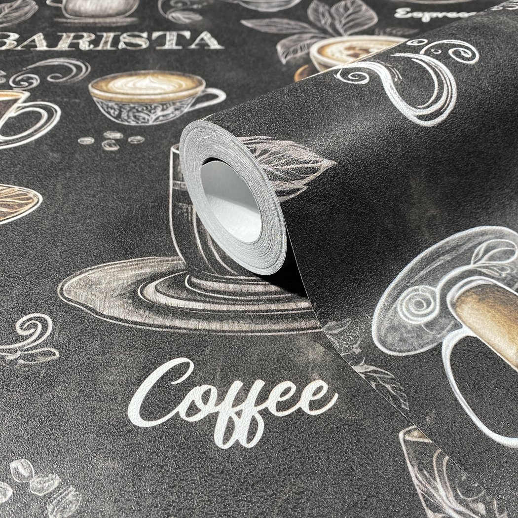 Struktura: Powierzchnia delikatnie chropowata w dotyku, struktura wyczuwalna. Tło tapety niejednolite kolorystycznie w brązowo czarnym odcieniu z szarymi przetarciami. Różne filiżanki, kubeczki z kawą oraz napisy opisujące kawę, wszystko to idealnie podkreśli charakter nowoczesnej kuchni oraz jadalni.