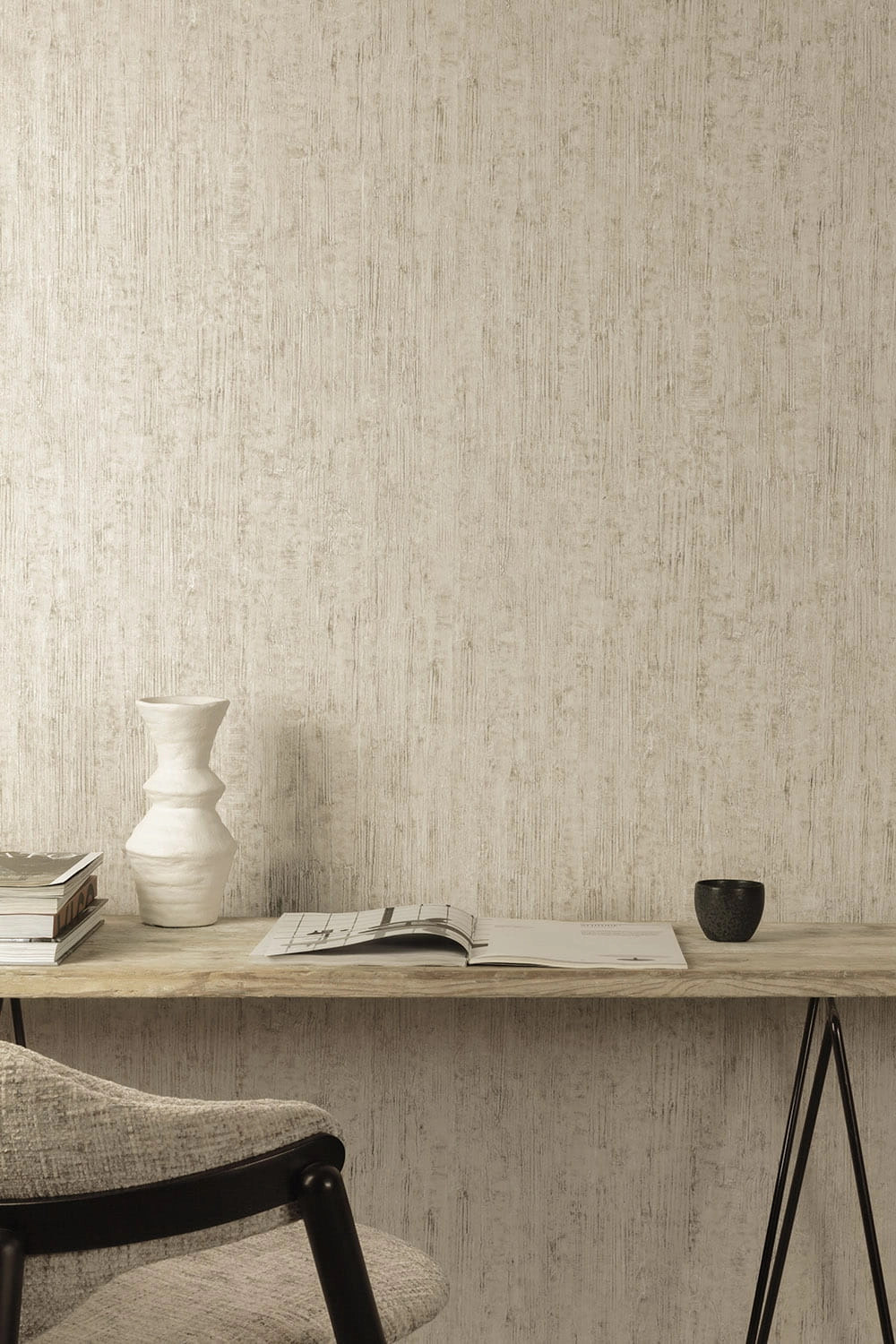 Struktura: Tapeta imituje strukturalną powierzchnię betonu lub tynku, z delikatnymi, pionowymi przetarciami przypominającymi ślady pacy lub deskowania. Faktura jest nieregularna, ale utrzymana w spokojnym, monochromatycznym stylu. Powierzchnia bardzo delikatnie chropowata w dotyku.