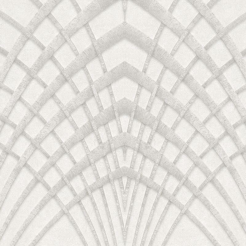 Tapeta w wzór geometryczny a kolorystyka jest w kremowym odcieniu, wzór tłoczony w prążki i delikatnie połyskujący, tło imituje drobną kaszkę w kolorze jasny ecru