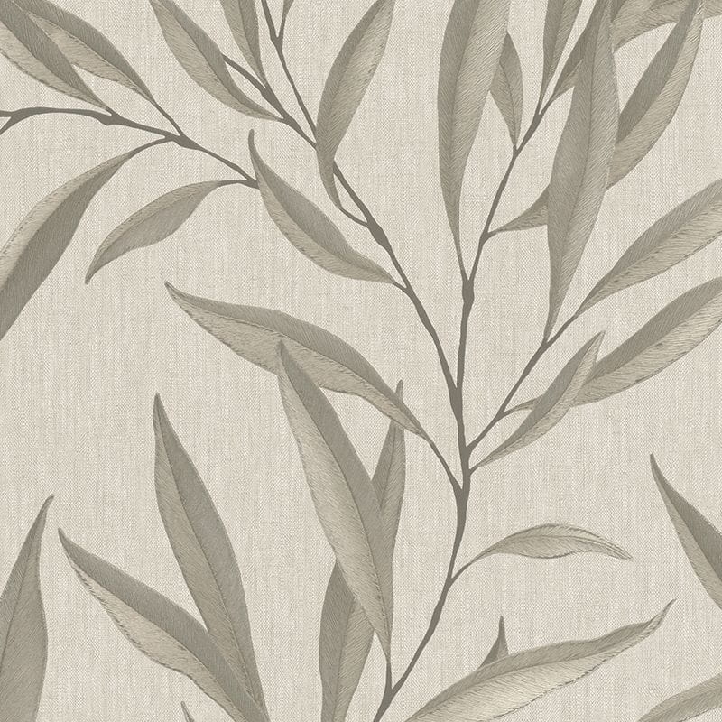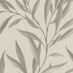 Tapeta w liście ciemnobeżowe (połyskujące), łodygi wklęsłe w tapecie i gładkiej strukturze o popielatej barwie, tło tapety imituje tkaninę w beżowym kolorze