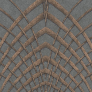 Tapeta w wzór geometryczny a kolorystyka jest w miedzianym odcieniu, wzór tłoczony w prążki i delikatnie połyskujący, tło imituje drobną kaszkę w odcieniu grafitowym