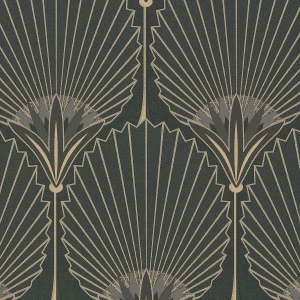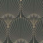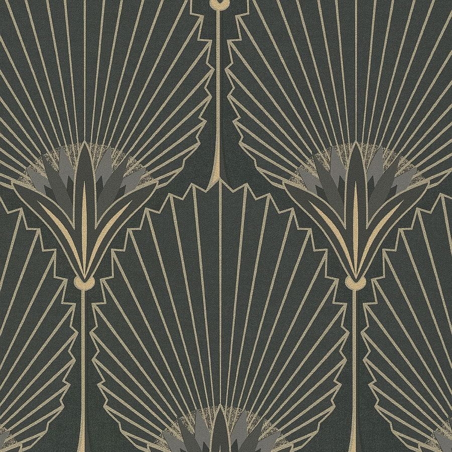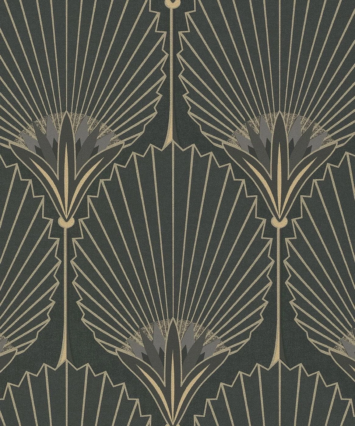 Winylowa tapeta ścienna na flizelinie, o powierzchni wypełnionej przez duże wachlarze liści o ciekawej, awangardowej formie i złoconych brzegach.