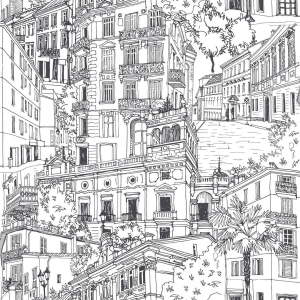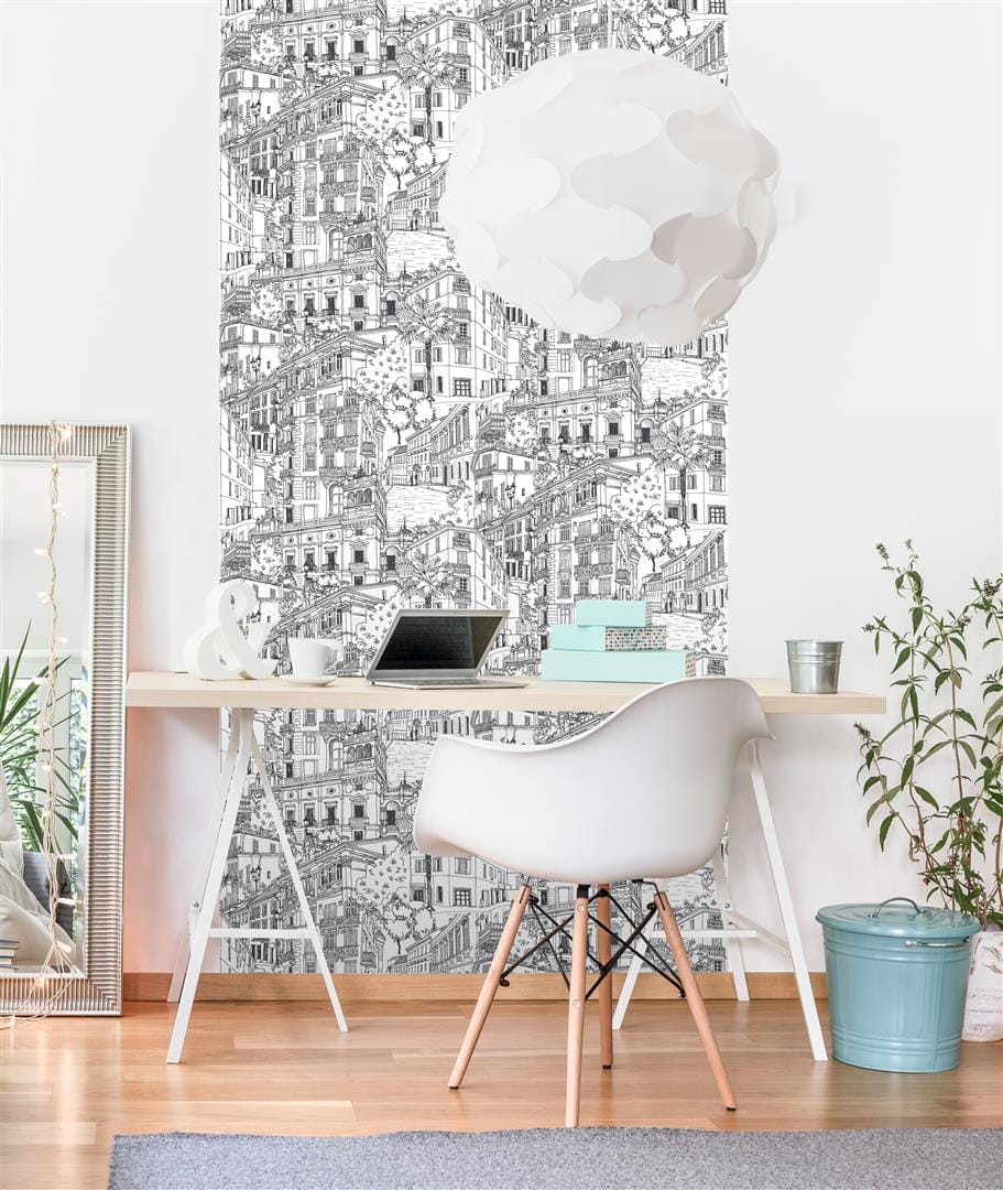 Tapeta z motywem miasta, budynków. Doskonale sprawdzi się jako motyw dekoracyjny na fragmencie ściany, lub jako wykończenie całego pomieszczenia.