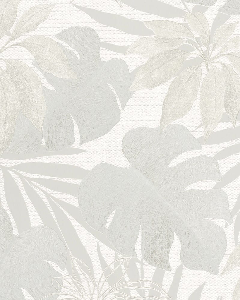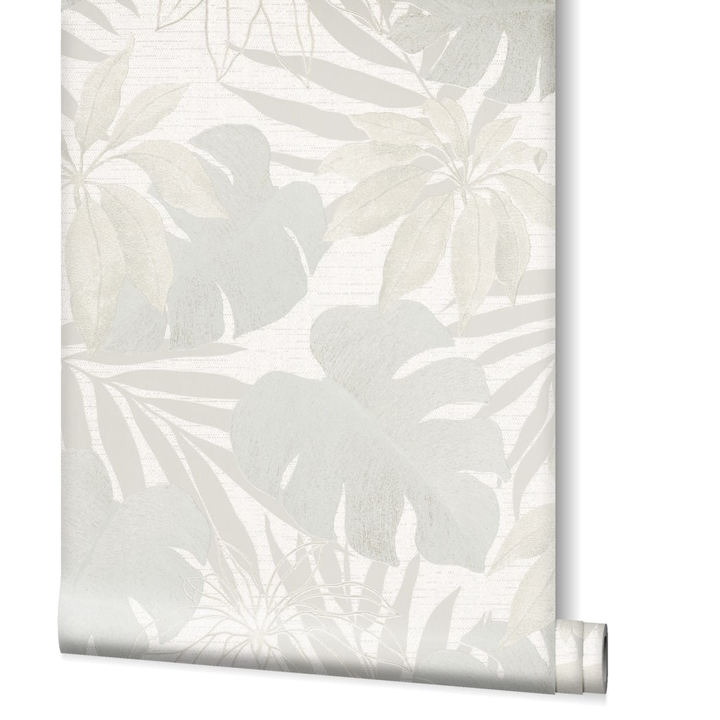 Tapeta w duże liście palmy monstery w odcieniu zimnego beżu bieli