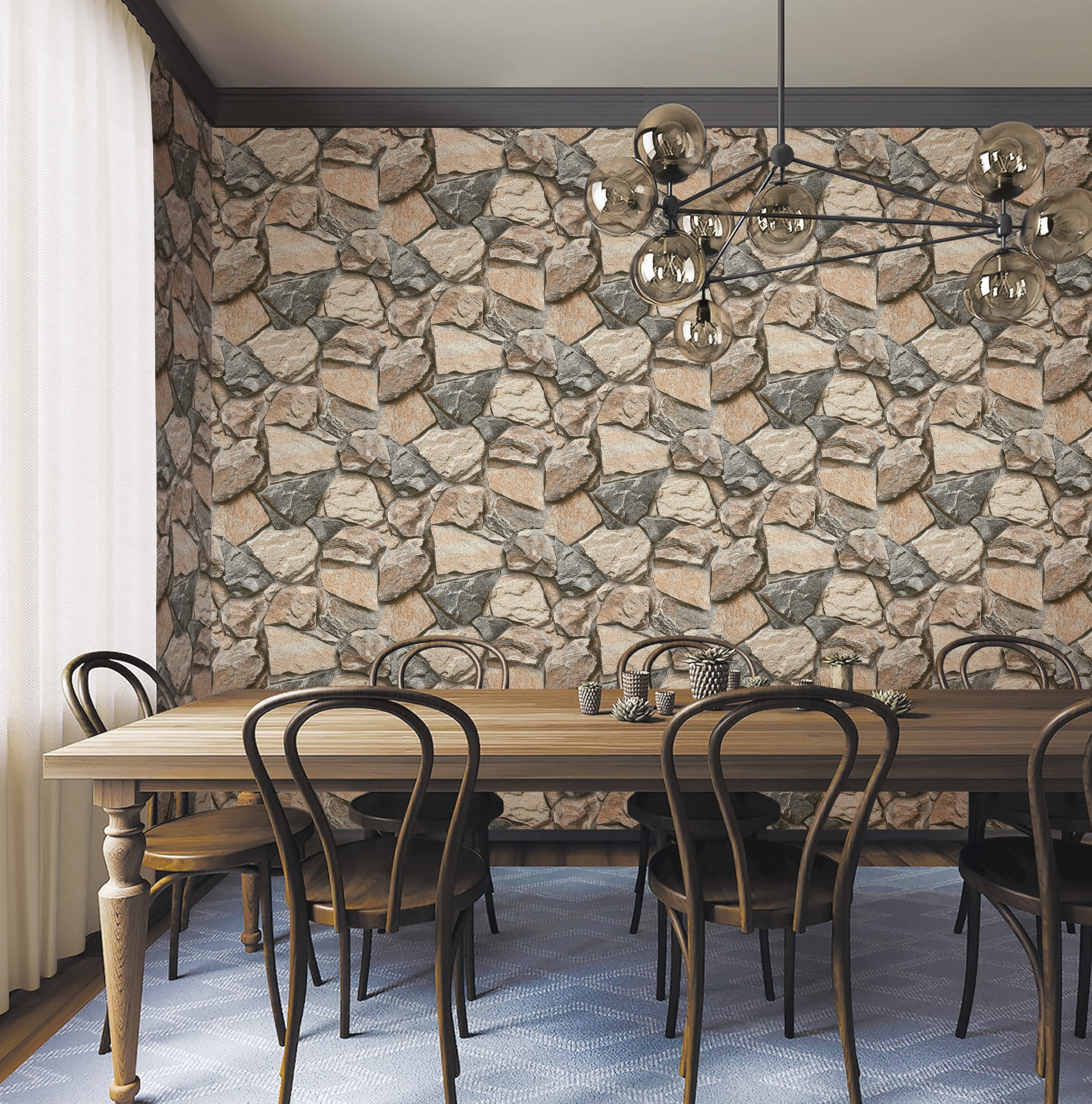 Tapeta imitująca kamień. Doskonale sprawdzi się jako motyw dekoracyjny na fragmencie ściany lub jako wykończenie całego pomieszczenia.
