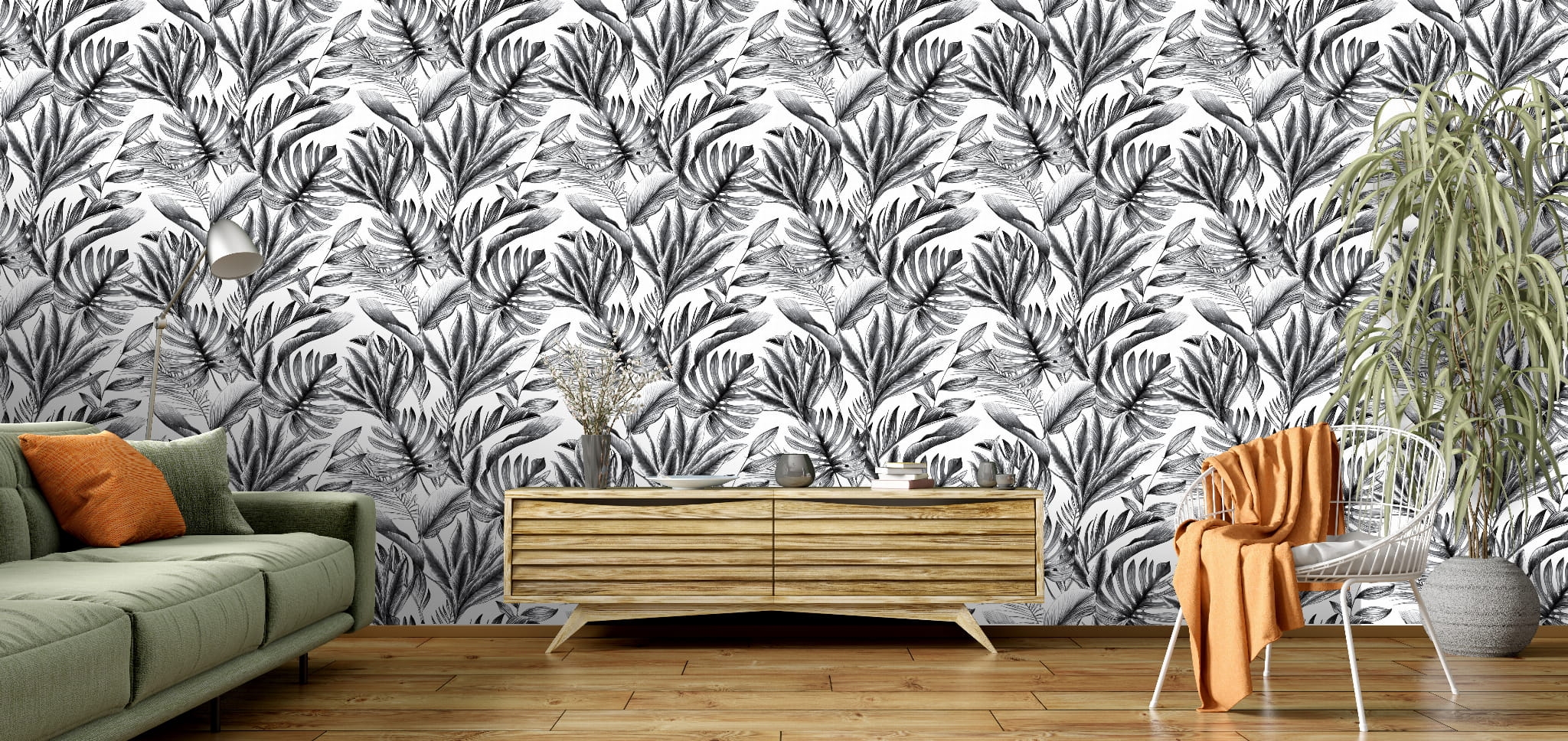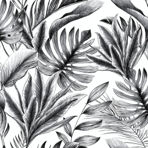 Tapeta ścienna na flizelinie, z motywem dużych liści, monstery, w odcieniach czerni i bieli.