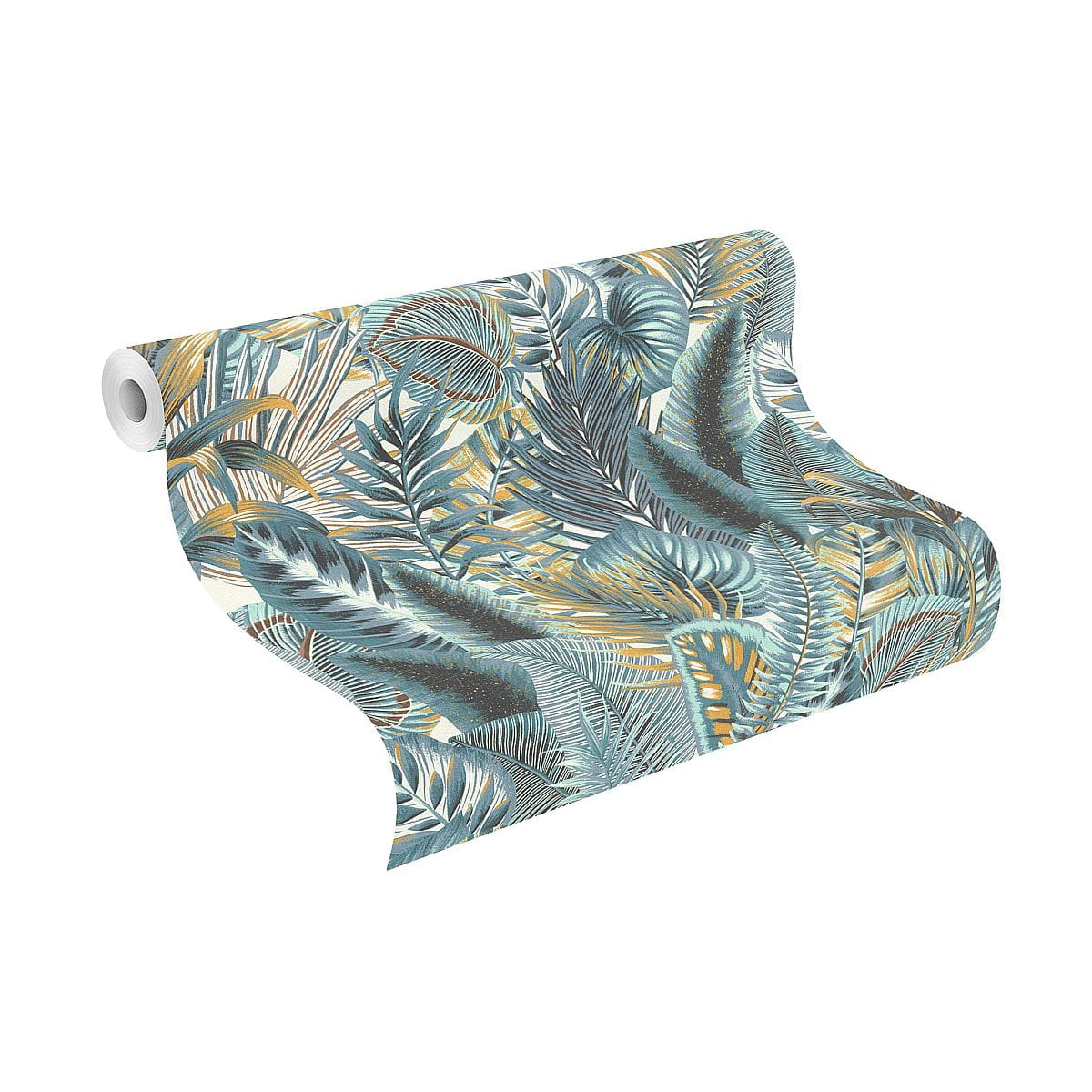 Tapeta ścienna na flizelinie, z motywem roślinnym, przedstawiającym gęste liście w niebiesko-turkusowej kolorystyce.
