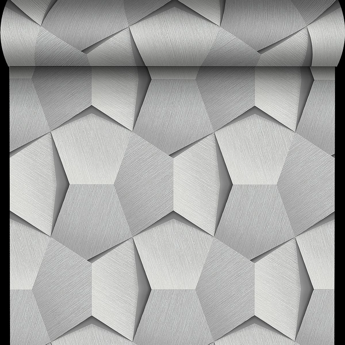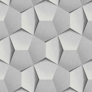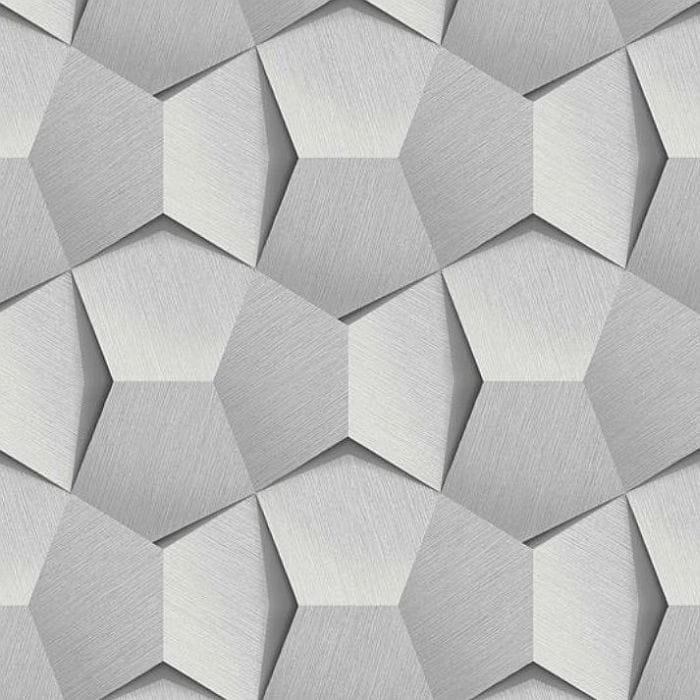 Tapeta ścienna flizelinowa, z motywem geometrycznym i widocznym efektem 3d, miejscami wzór połyskuje srebrem.