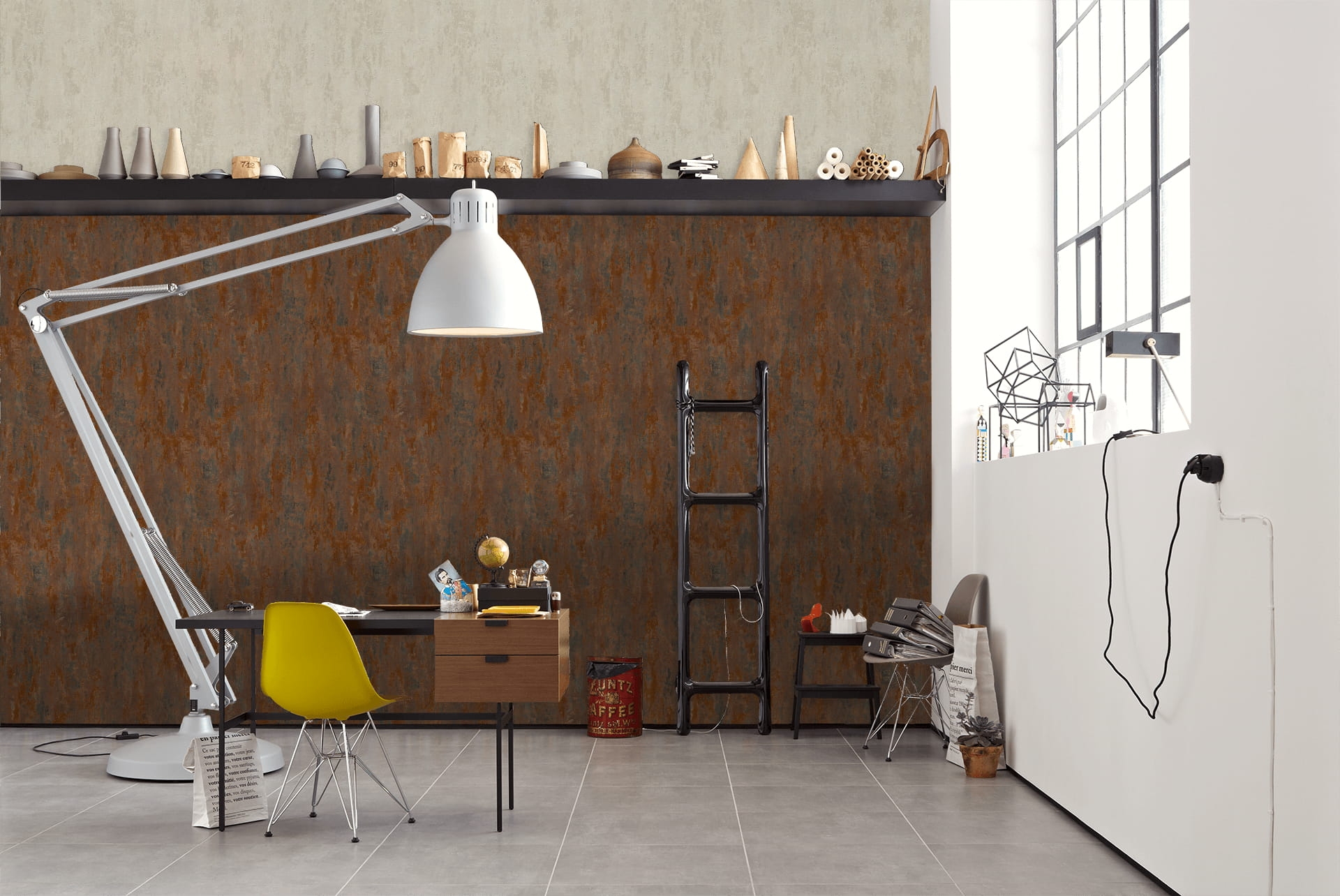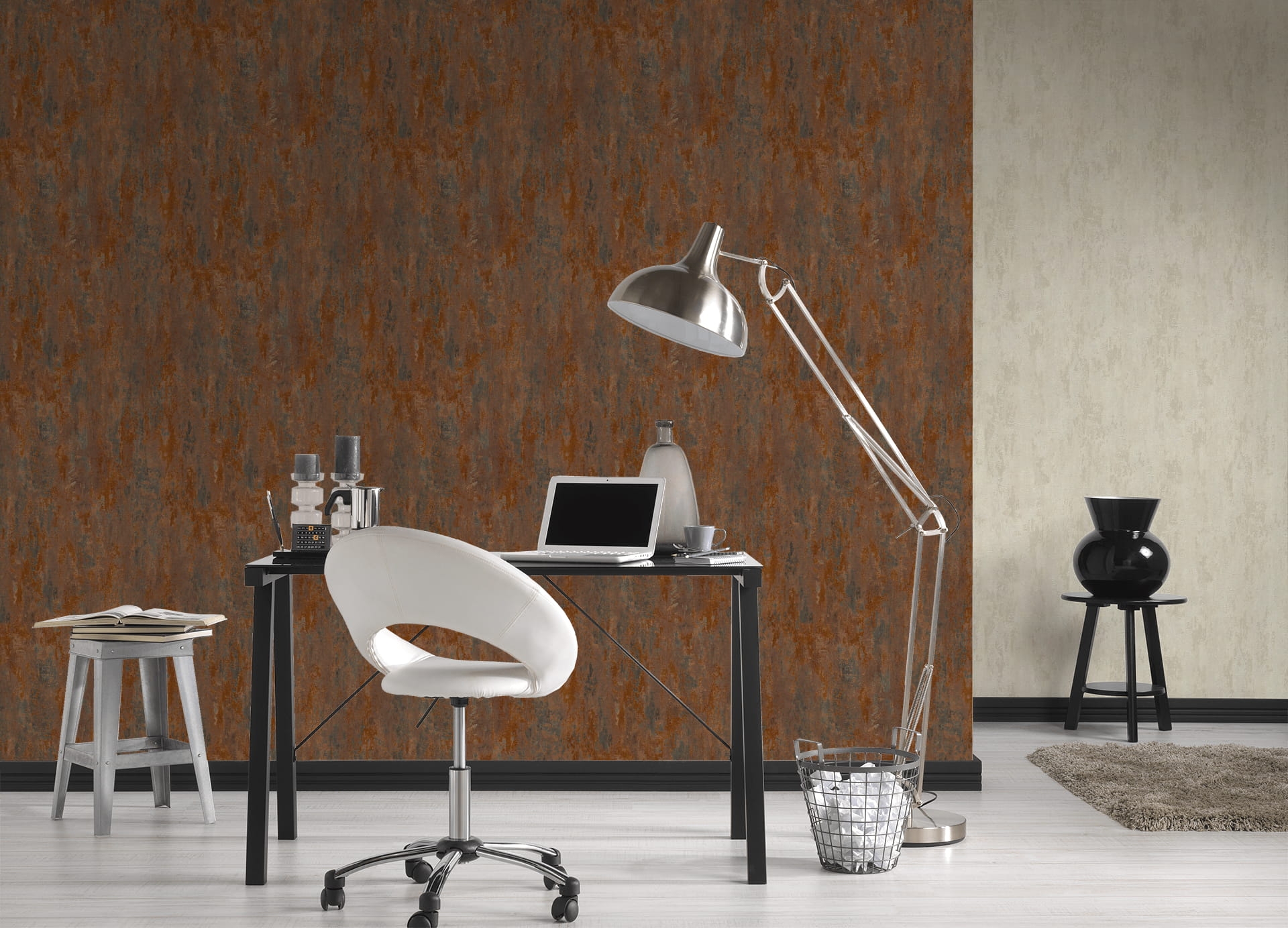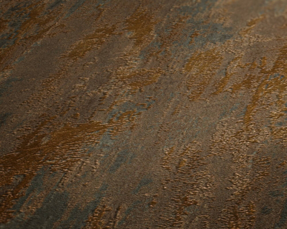 Ten wzór znajdzie uznanie wśród osób, które lubią surowy i naturalne wykończenie wnętrz o stonowanej kolorystyce. Powierzchnia tapety o wyraźnym nieregularnym tłoczeniu i różnej gradacji zagęszczenia wzoru. Motyw w odcieniach miedzianego brązu i szarości z widocznymi nieregularnymi przecierkami, mniejszymi i większymi gładkimi płaszczyznami połyskującymi perłową poświatą. Forma tłoczenia/ przecierania wzoru i operowanie kolorem daje bardzo ciekawy efekt, sprawiając że wzór doskonale imituje stiuk-ozdobny tynk. Tapetę można wykorzystać do wykończenia jednej, wybranej ściany lub całego pomieszczenia, połączyć z pasującymi tapetami o podobnym charakterze, jak również może ona stanowić dodatek do pomalowanych ścian. Dekoracja o takim charakterze sprawi, że wnętrze zyska nowy, niepowtarzalny styl i charakter.