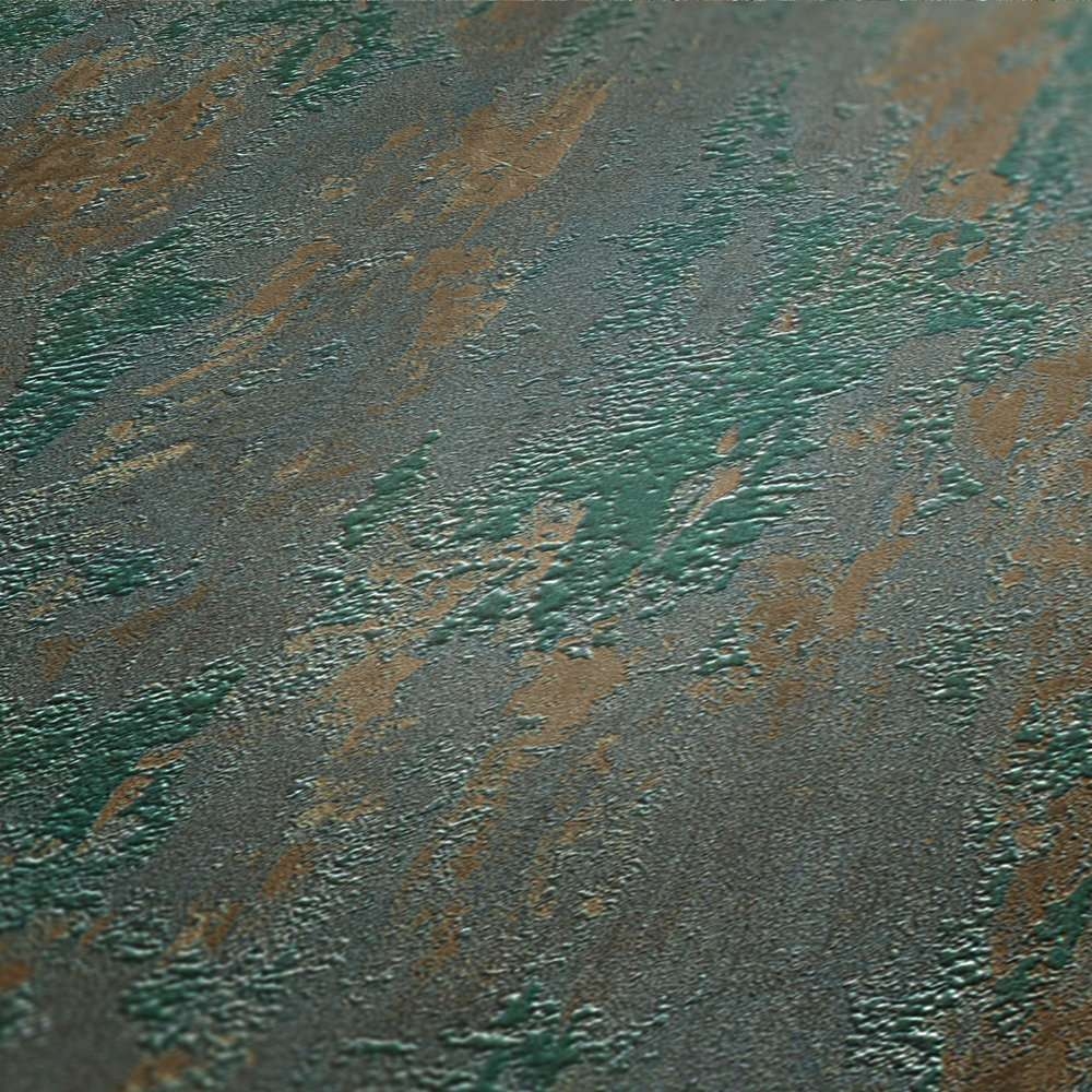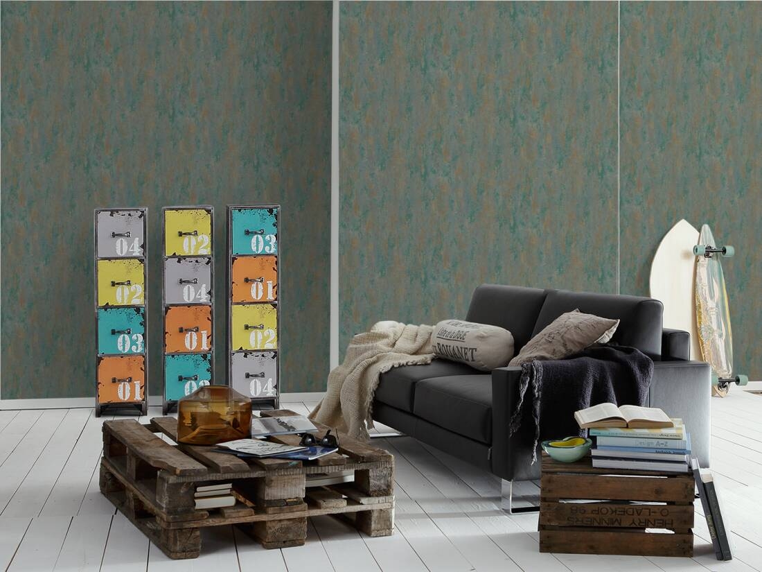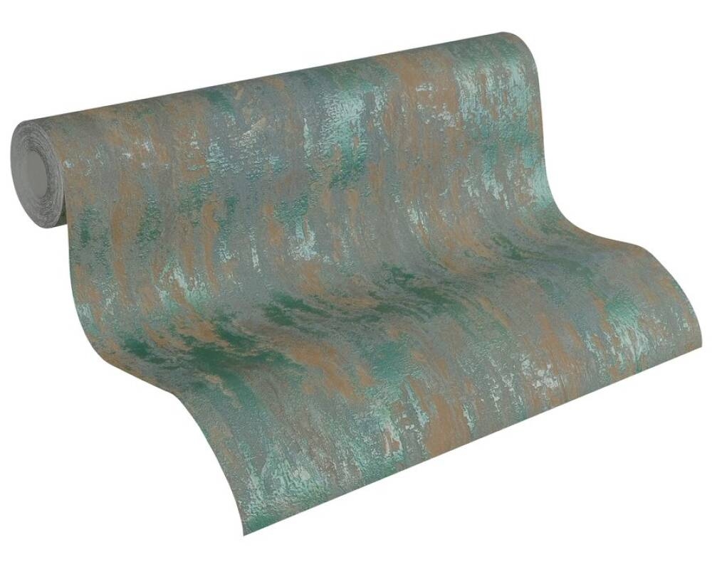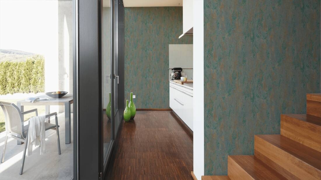 Ten wzór znajdzie uznanie wśród osób, które lubią surowe i naturalne wykończenie wnętrz o stonowanej kolorystyce. Powierzchnia tapety o wyraźnym nieregularnym tłoczeniu i różnej gradacji zagęszczenia wzoru. Motyw w odcieniach ciemnej, zgaszonej zieleni i miejscami brązu, z widocznymi nieregularnymi przecierkami, mniejszymi i większymi gładkimi płaszczyznami połyskującymi perłową poświatą. Forma tłoczenia/ przecierania wzoru i operowanie kolorem daje bardzo ciekawy efekt, sprawiając że wzór doskonale imituje ozdobny tynk. Tapetę można wykorzystać do wykończenia jednej, wybranej ściany lub całego pomieszczenia, połączyć z pasującymi tapetami o podobnym charakterze, jak również może ona stanowić dodatek do pomalowanych ścian. Dekoracja o takim charakterze sprawi, że wnętrze zyska nowy, niepowtarzalny styl.