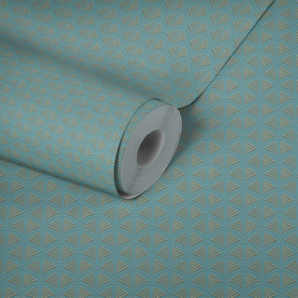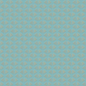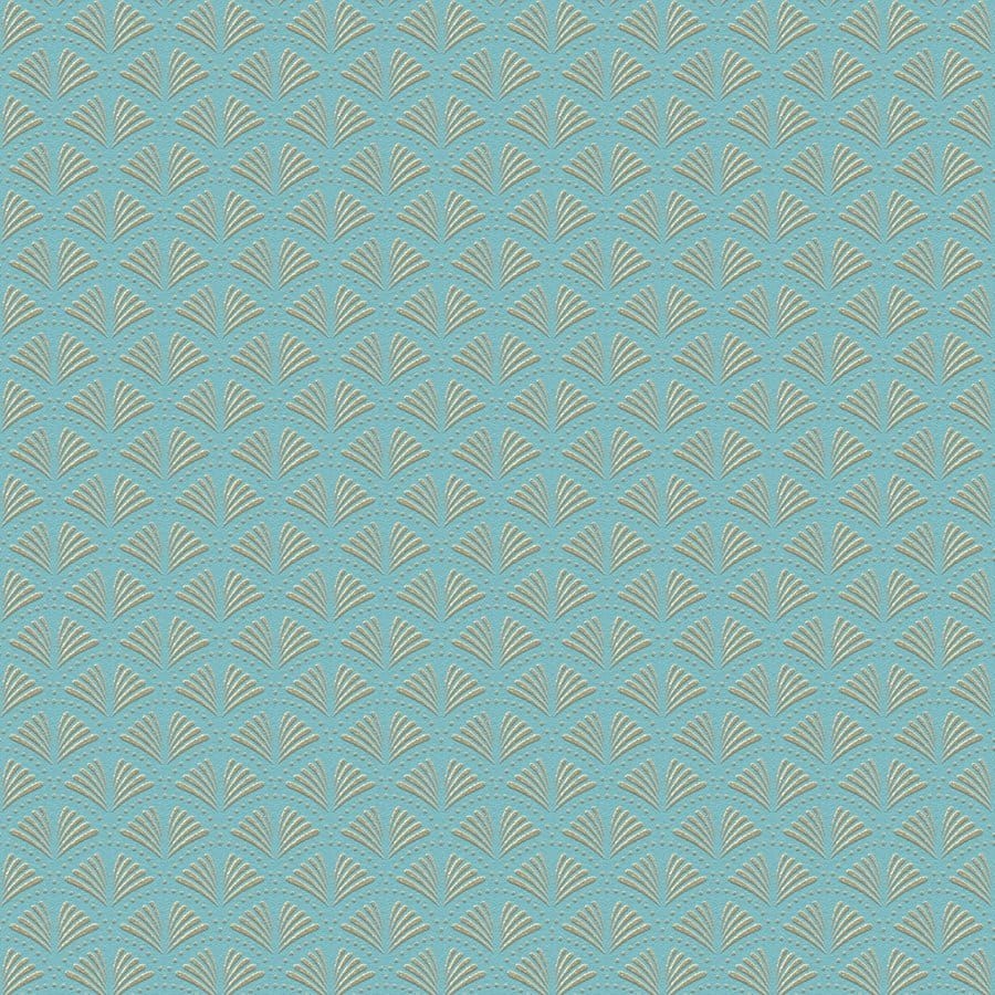 Tapeta ścienna winylowa na flizelinie, tapeta z drobnym motywem o kształcie wachlarzyków w odcieniu jasnego turkusu z dodatkiem złotego brokatu.