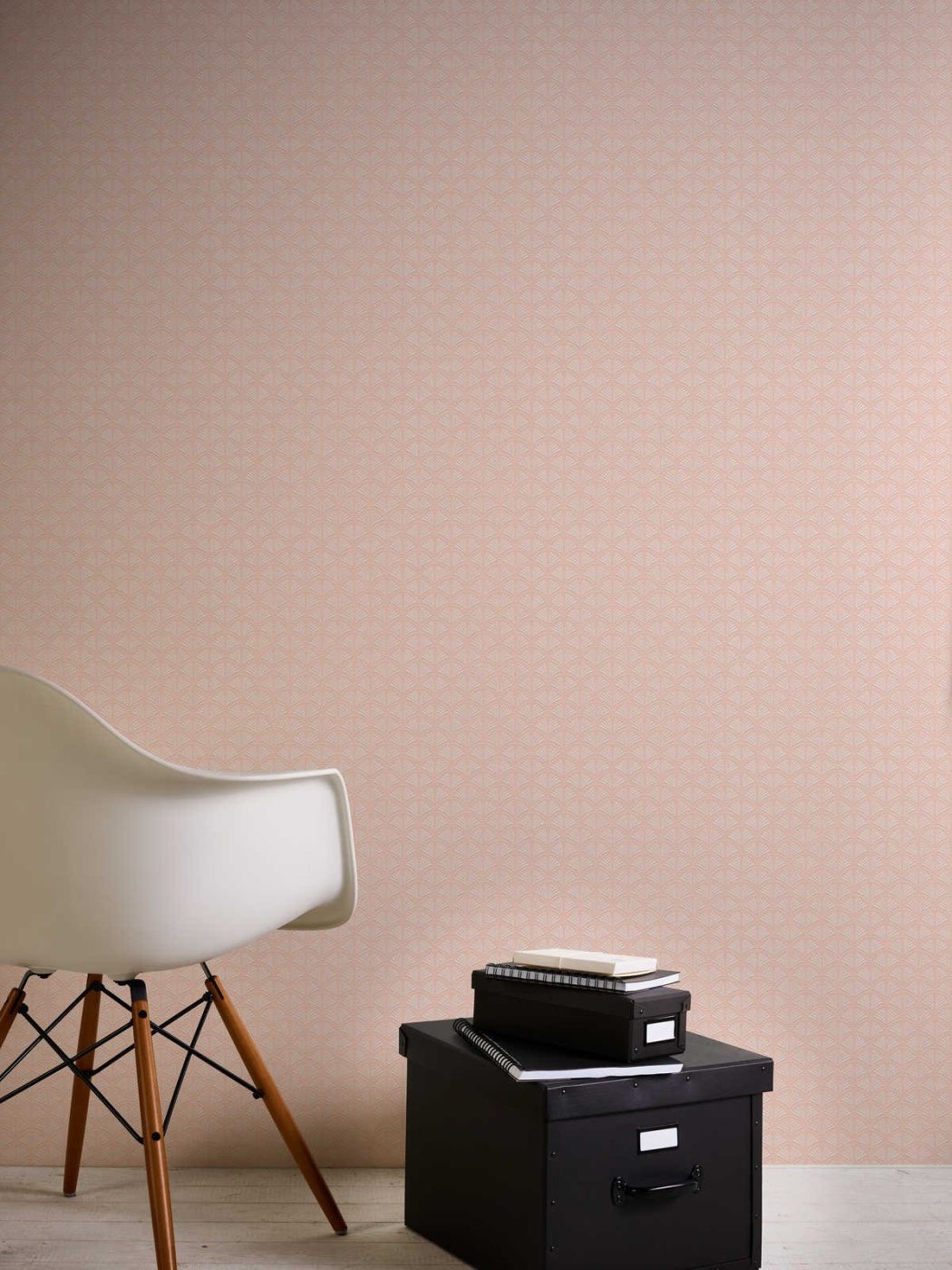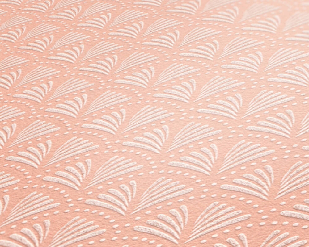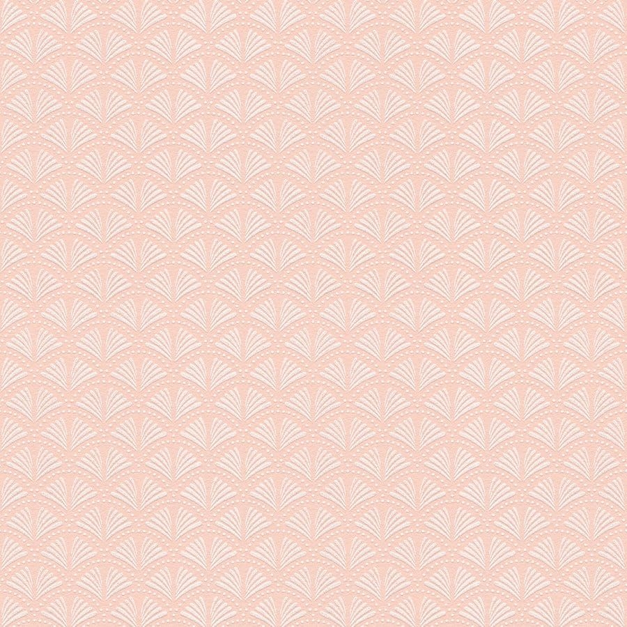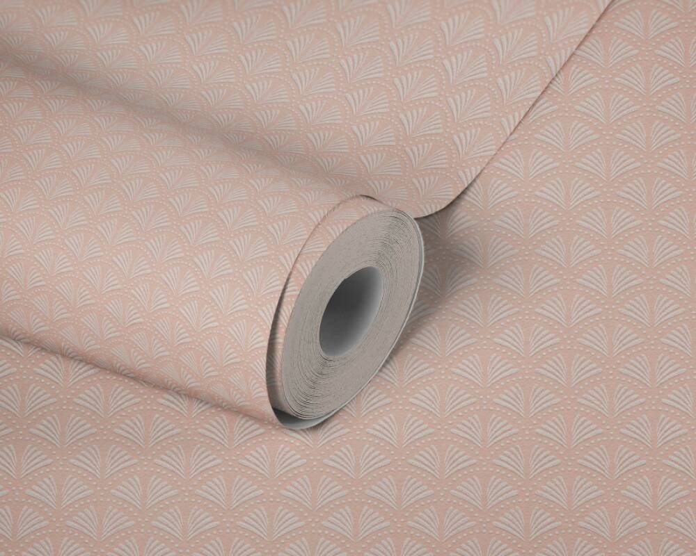 Tapeta ścienna winylowa na flizelinie, tapeta z drobnym motywem o kształcie wachlarzyków w kolorze białym na jasnoróżowym tle.