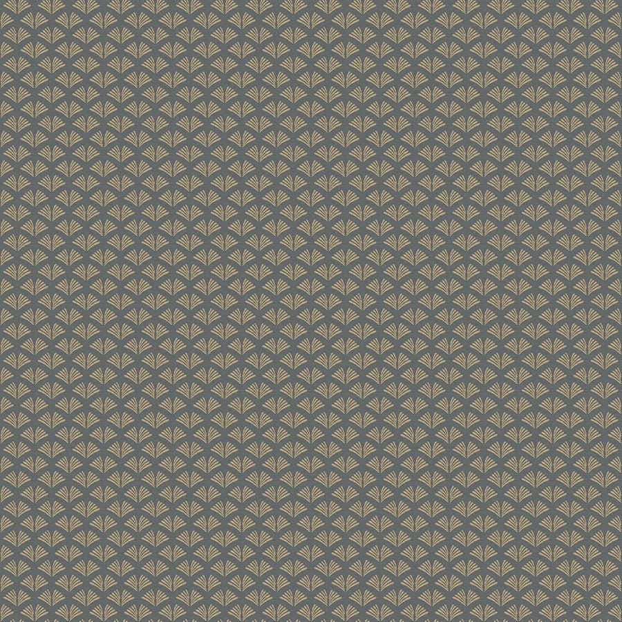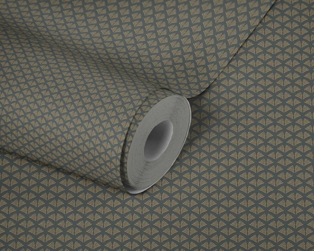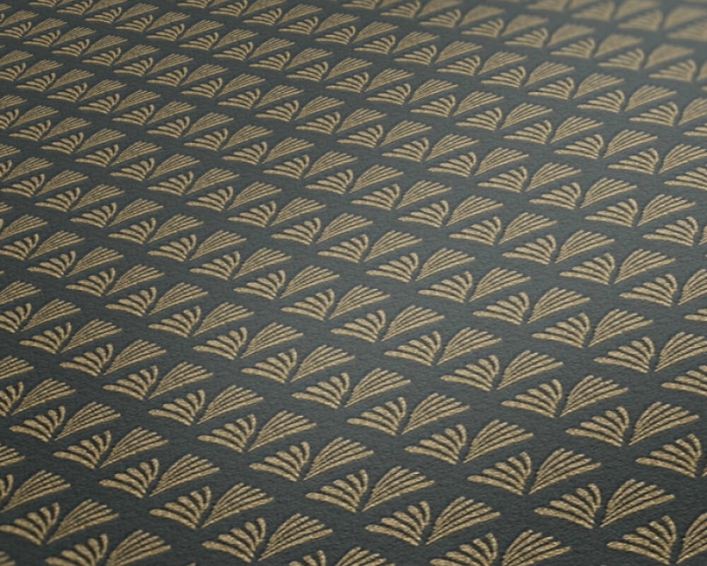 Tapeta ścienna winylowa na flizelinie, tapeta z drobnym, złoconym wzorem o kształcie wachlarzyków na ciemnym, antracytowym tle.