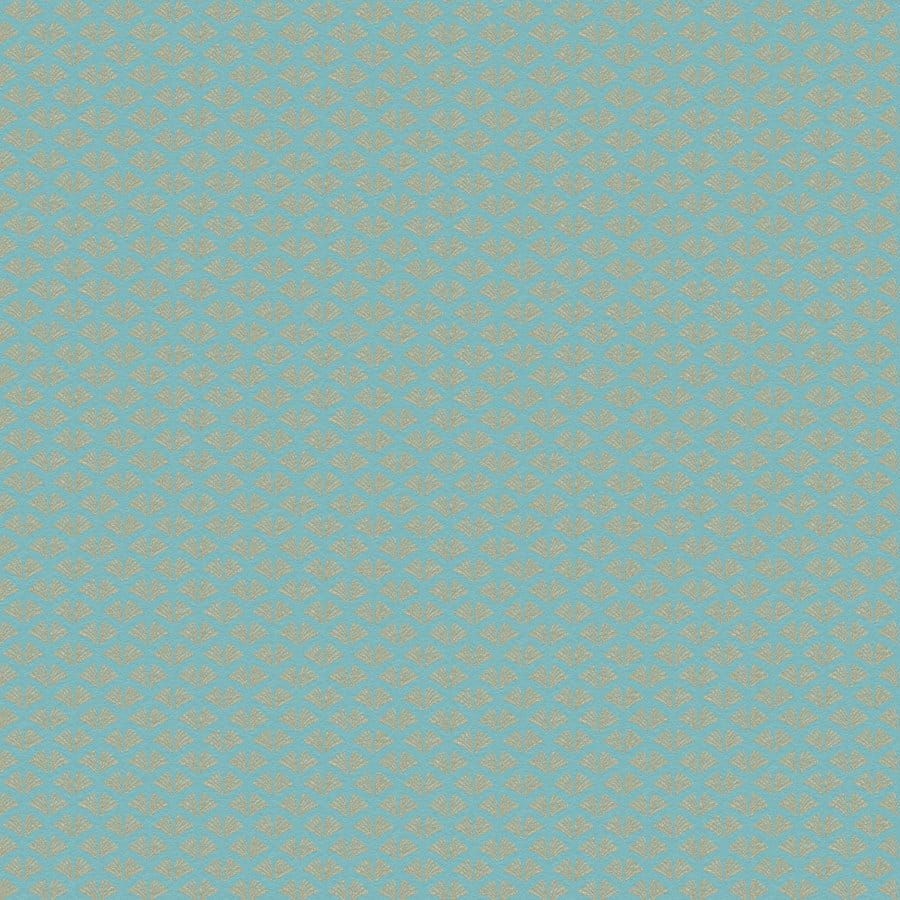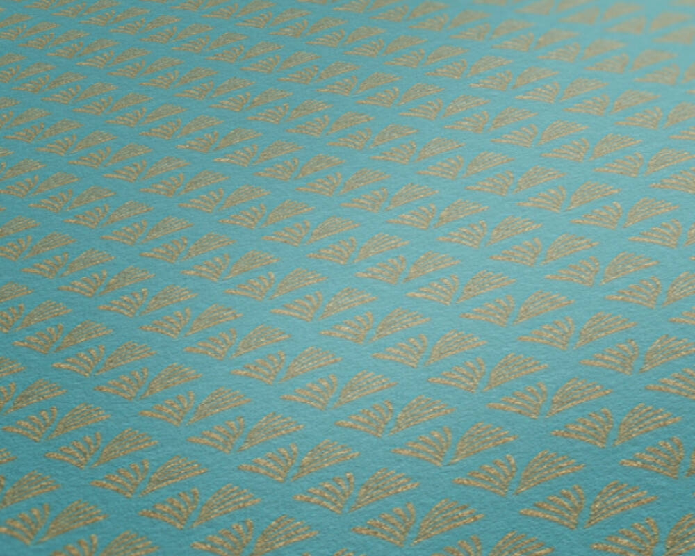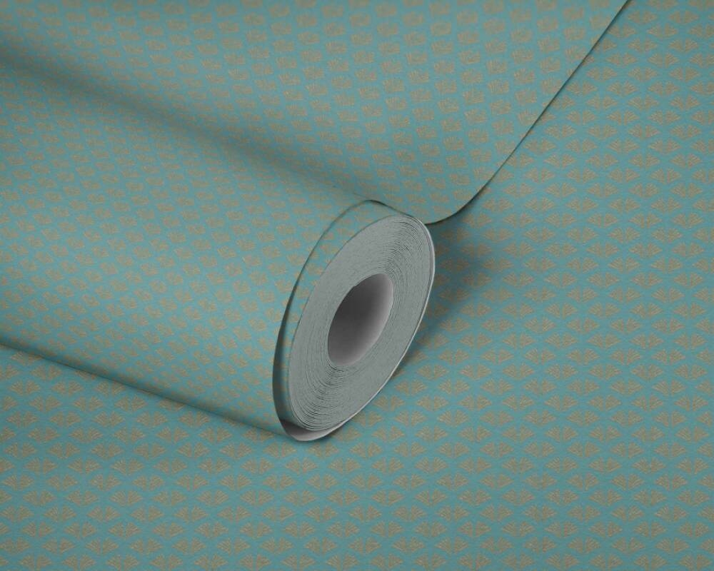 Tapeta ścienna winylowa na flizelinie, tapeta z drobnym, złoconym wzorem o kształcie wachlarzyków na tle w odcieniu jasnego turkusu.