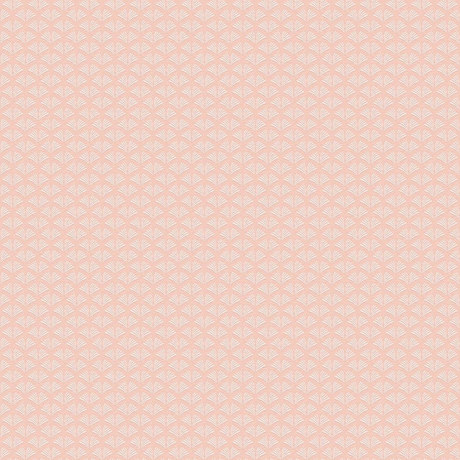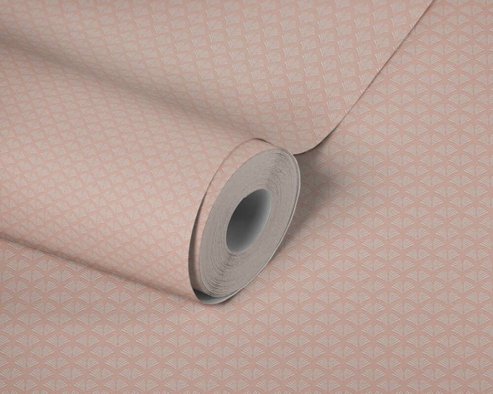 Tapeta ścienna winylowa na flizelinie, tapeta z drobnym, białym wzorem o kształcie wachlarzyków na pastelowym tle w odcieniu różu.