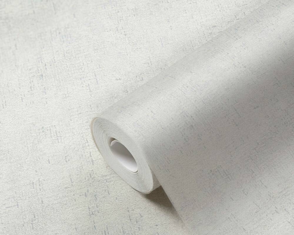 Tapeta występuje w odcieniu biało-szarym, z delikatnymi elementami połyskującymi srebrem.