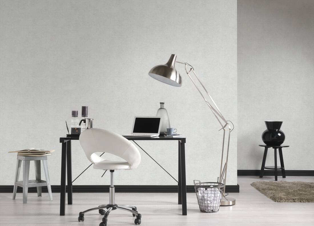 Ten wzór znajdzie uznanie wśród osób, które lubią surowe i naturalne wykończenie wnętrz o stonowanej kolorystyce. Aranżacja jest w naturalnych odcieniach jasnej, szarości, miejscami złamanej bielą, z drobnymi, lekko połyskującymi srebrem elementami. Powierzchnia jest o kolorze wyraźnie przecieranym, niejednolitym, tworzy powłokę przypominającą tynk/beton. Połączenie surowego betonu i eleganckich-srebrnych dodatków dodaje aranżacji niepowtarzalnego wyglądu. Tapetę można wykorzystać do wykończenia jednej, wybranej ściany lub całego pomieszczenia, połączyć z pasującymi tapetami o podobnym charakterze, jak również może ona stanowić dodatek do pomalowanych ścian. Dekoracja o takim charakterze sprawi, że wnętrze zyska nowy, niepowtarzalny styl.
