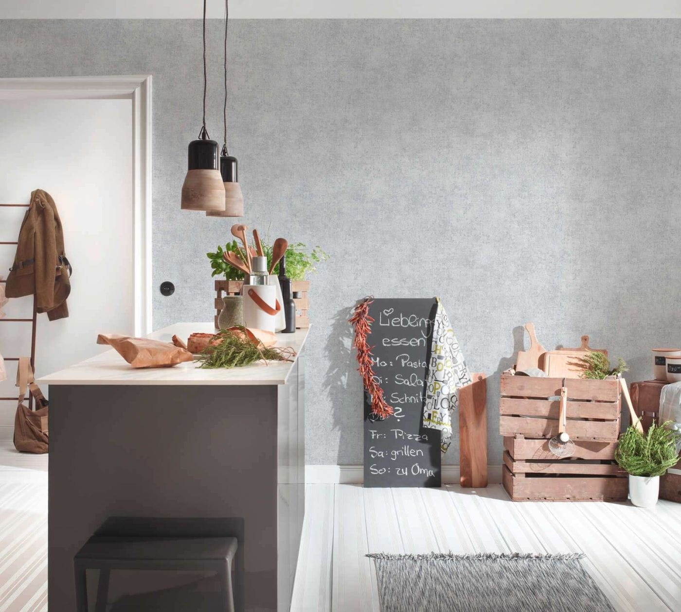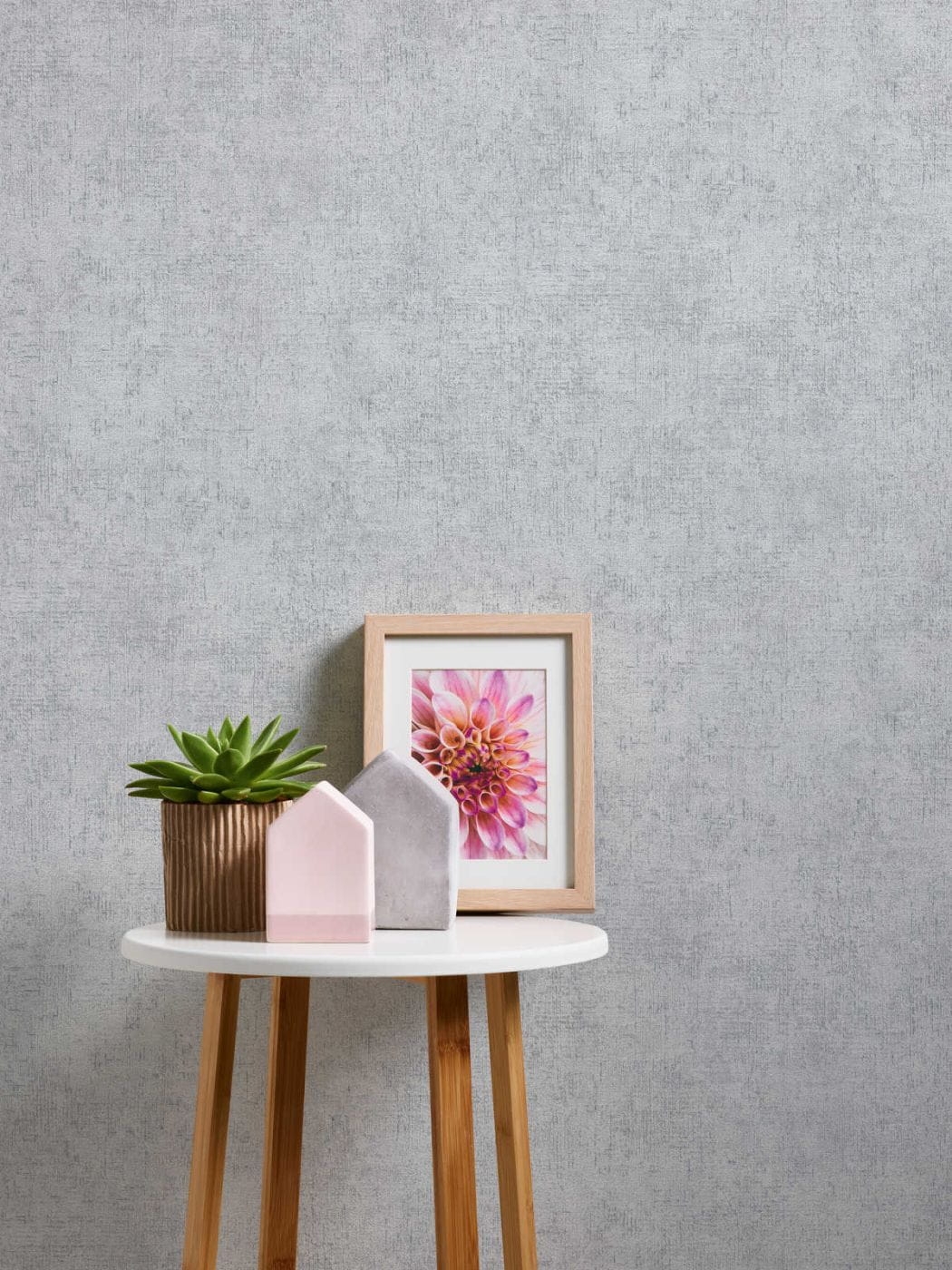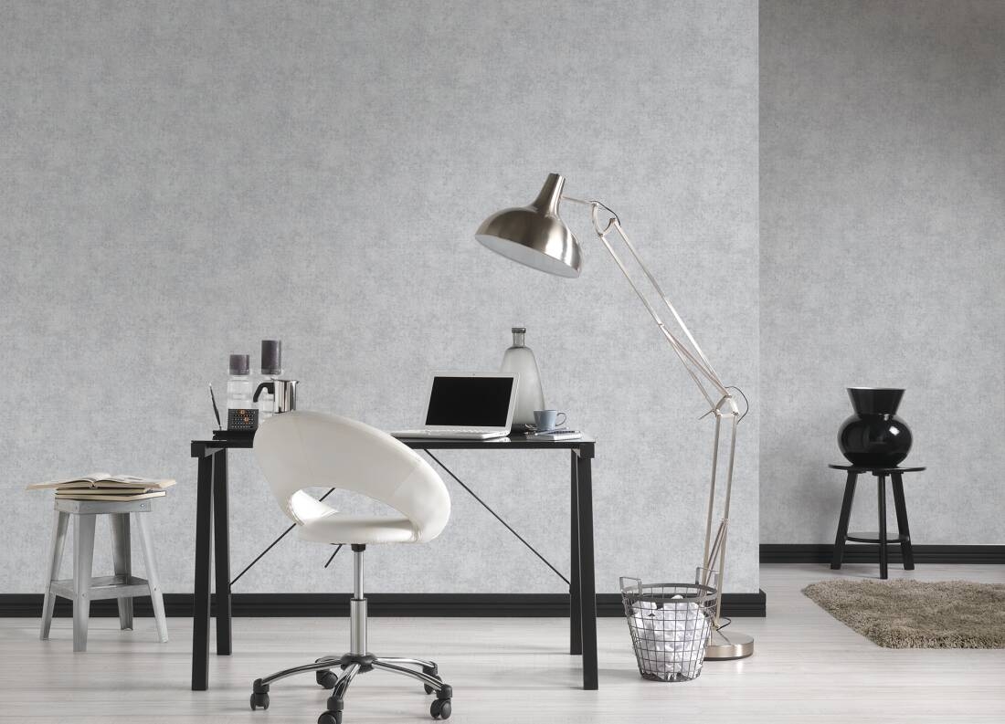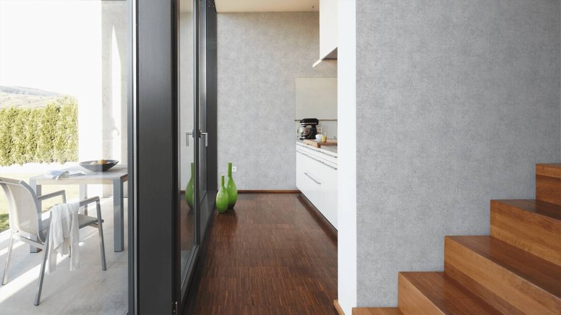 Ten wzór znajdzie uznanie wśród osób, które lubią surowe i naturalne wykończenie wnętrz o stonowanej kolorystyce. Aranżacja jest w naturalnych odcieniach jasnej szarości, z drobnymi, lekko połyskującymi srebrem elementami. Powierzchnia jest o kolorze wyraźnie przecieranym, niejednolitym, tworzy powłokę przypominającą tynk/beton. Połączenie surowego betonu i eleganckich-srebrnych dodatków dodaje aranżacji niepowtarzalnego wyglądu. Tapetę można wykorzystać do wykończenia jednej, wybranej ściany lub całego pomieszczenia, połączyć z pasującymi tapetami o podobnym charakterze, jak również może ona stanowić dodatek do pomalowanych ścian. Dekoracja o takim charakterze sprawi, że wnętrze zyska nowy, niepowtarzalny styl.