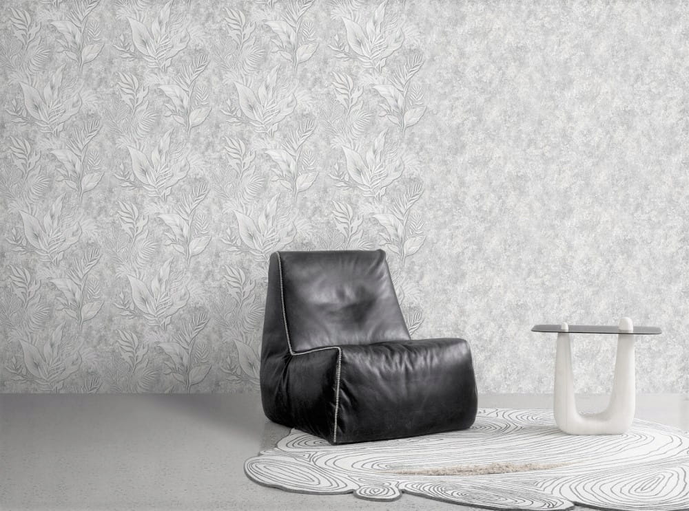 - Rodzaj wzoru: tapeta gruba, kryjąca o strukturze tynku z ozdobnymi liściami w panelu